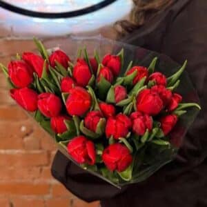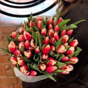 Пачка красно-белых тюльпанов 50 шт без сборки