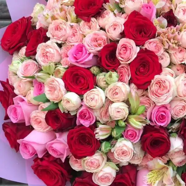 Альстромерия – 10 шт. Розовая роза – 30 шт. Лента атласная – 2 шт. Красная роза – 20 шт. Упаковка дизайнерская – 7 шт. Кустовая роза Лидия – 30 шт.