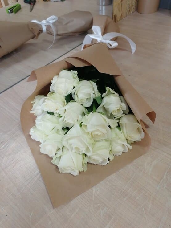 Белая роза – 15, упаковка крафт – 1, атласная лента – 1.