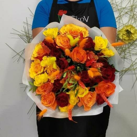 Роза - 17; Роза кустовая - 4; Писташ - 1; Тритикум - 10; Лагурус - 20; Пленка - 1; Лента атласная - 1