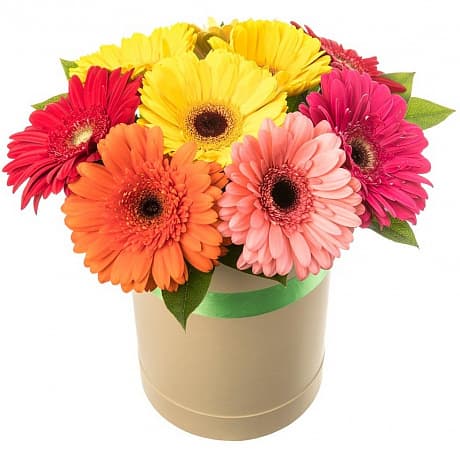 Состав: 9 разноцветных гербер, декоративная зелень. Декоративная коробка. Высота коробки 20см, диаметр коробки 20см. Цветы помещены в цветочную биофлору, что позволяет им сохранять свежесть долгое время.