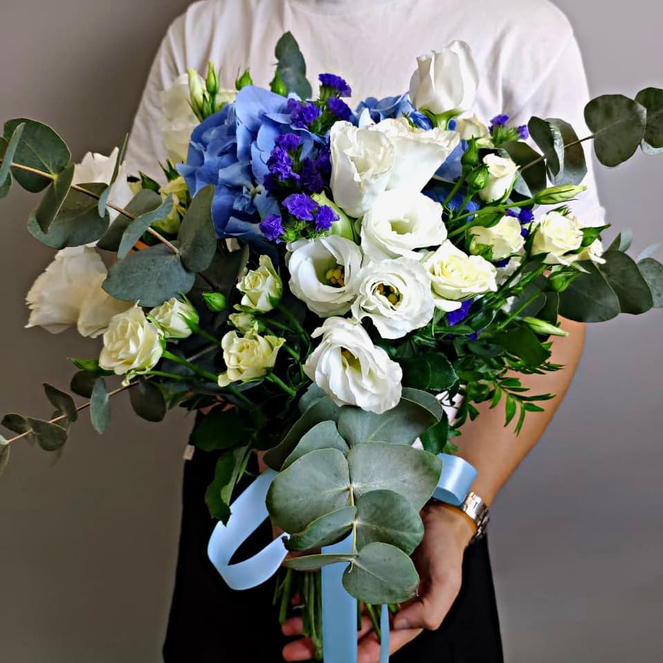 Гортензия Голландия (голубой) – 1 шт, роза кустовая Кения микс (40см) (микс нежных светлых розовых) – 3 шт, белые эустомы- 6 шт, эвкалипт (маленький) – 1 шт