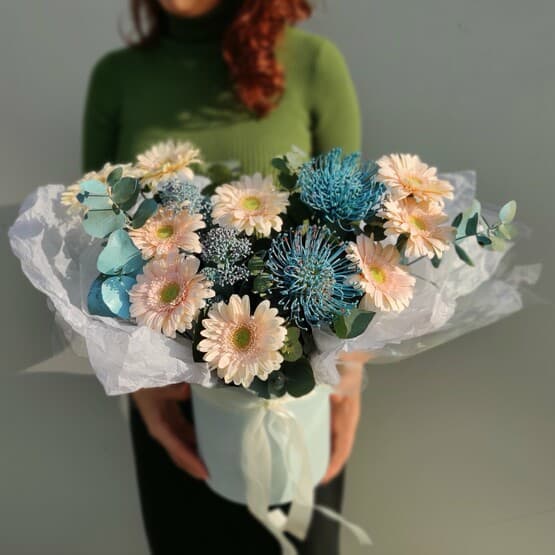 Композиция из гербер, леукоспермума, скимии и эвкалипт в шляпной коробке с атласными лентами.