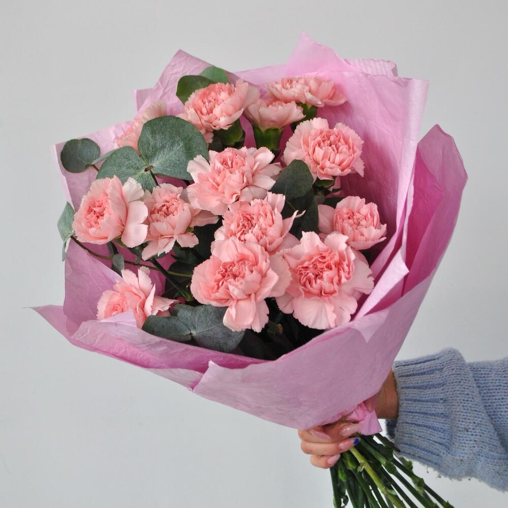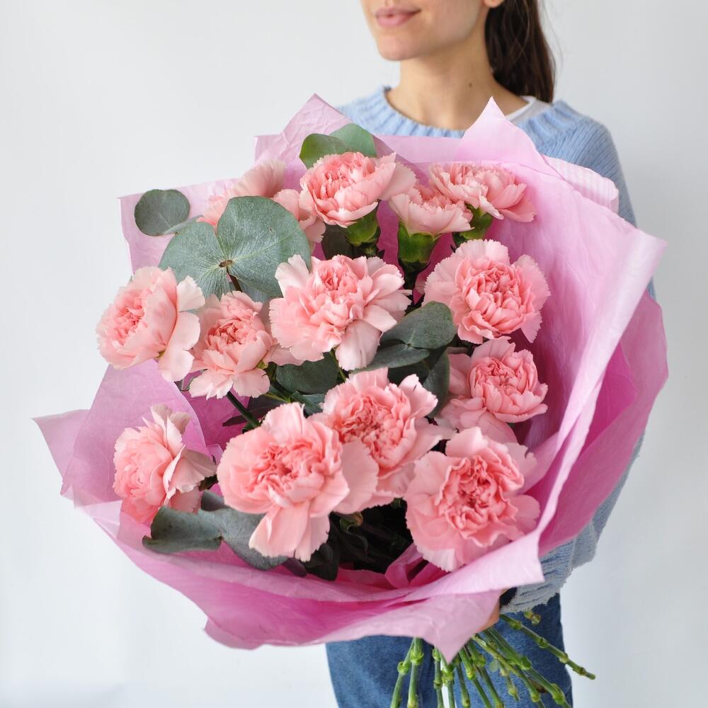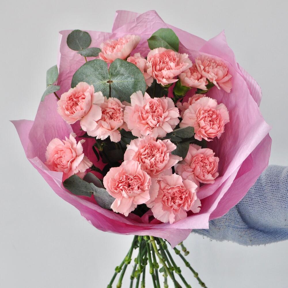 Эвкалипт - 3 шт. Упаковка дизайнерская - 1 шт. Гвоздика сортовая розовая - 15 шт.