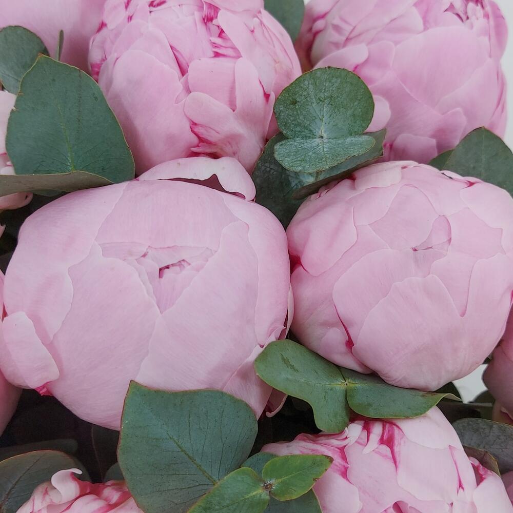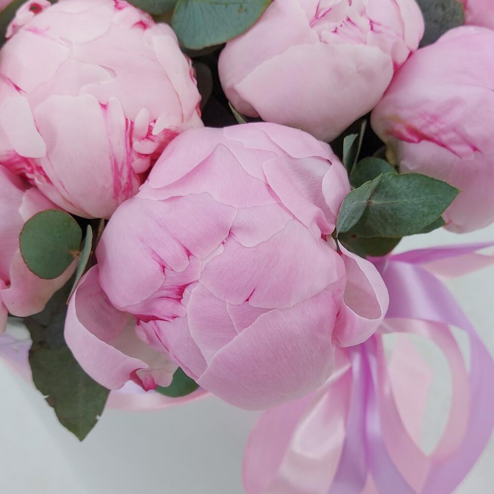Эвкалипт – 8 шт. Лента атласная – 2 шт. Пион Сара Бернар – 15 шт. Коробка цилиндр – 1 шт. Флористическая губка (оазис) – 2 шт.