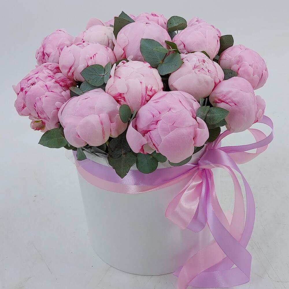 Эвкалипт - 8 шт. Лента атласная - 2 шт. Пион Сара Бернар - 15 шт. Коробка цилиндр - 1 шт. Флористическая губка (оазис) - 2 шт.