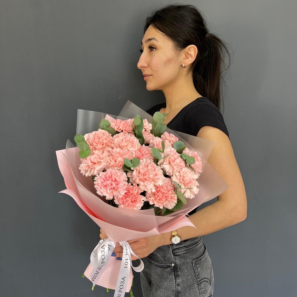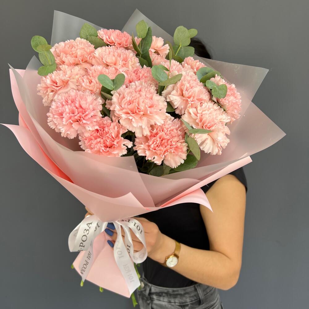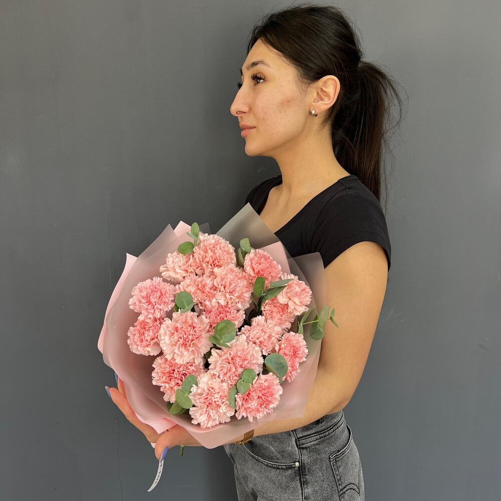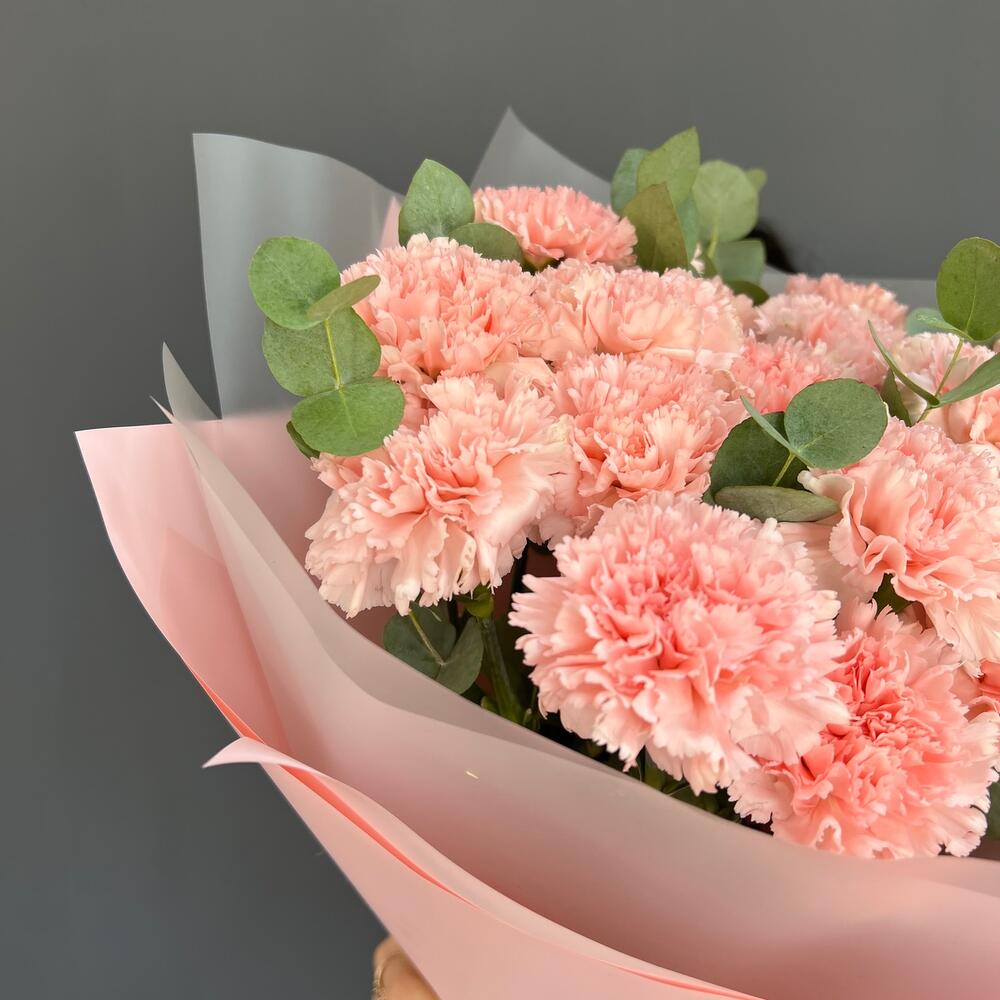 Нежно-розовые гвоздики — нежный и очаровательный цветок, который часто ассоциируется с благодарностью и восхищением. В сочетании с эвкалиптом композиция приобретает более приземленный вид. Приглушенный зеленый цвет эвкалипта придает естественный оттенок мягкости розовых гвоздик.Памятка по уходу за букетом:1. Налейте в вазу холодную воду до точки перевязки букета2. Подрежьте стебли острым ножом или секатором под углом 45″3. Ежедневно подрезайте стебли и меняйте воду4. Ваза с букетом не должна находиться вблизи отопительных приборов, на сквозняке и под прямыми лучами солнцаС букетом мы отправляем бесплатную открытку (по Вашему желанию), средство для продления жизни срезанных цветов (1 шт) и памятку по уходу за букетом.Букет можно дополнить набором из гелиевых шаров или сладостями