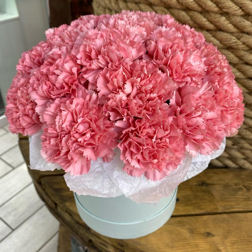 Тишью - 1 шт. Коробка шляпная - 1 шт. Диантус розовый - 25 шт. Оазис флористический - 1 шт.