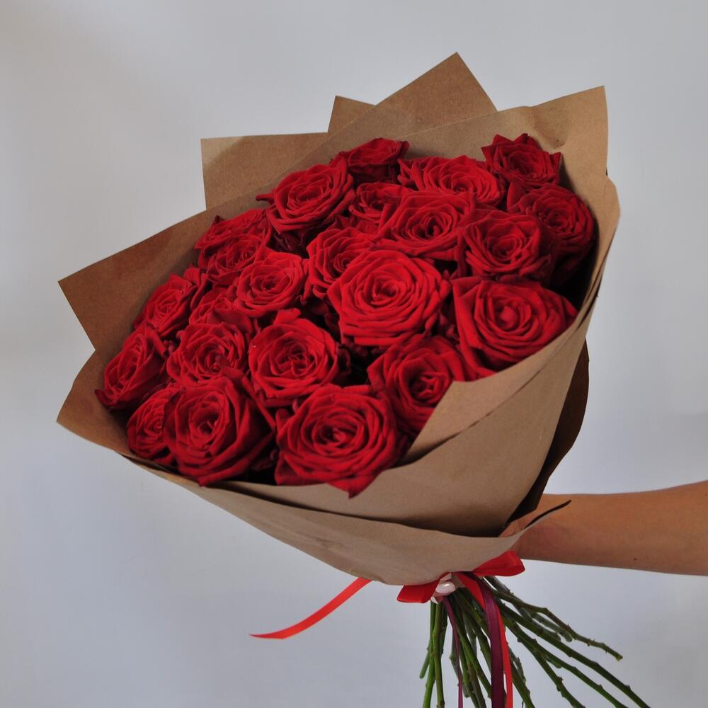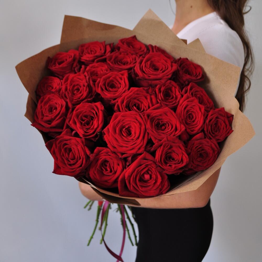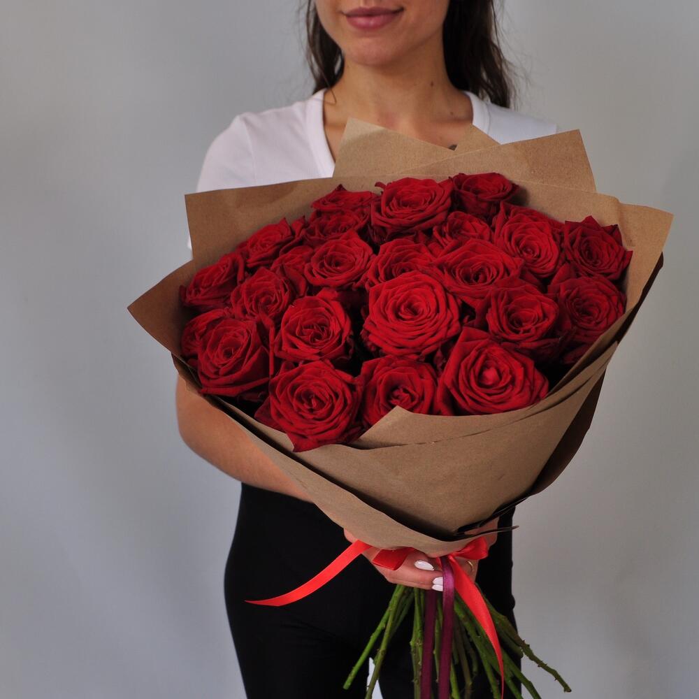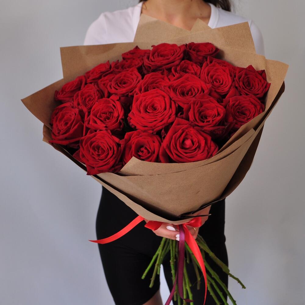 25 ароматных роз 60 смРоза РоссияКрасные розы в крафтовой упаковке – прекрасный стильный подарок, который точно понравится.Самым любимым женщинам – дарите красные розы!