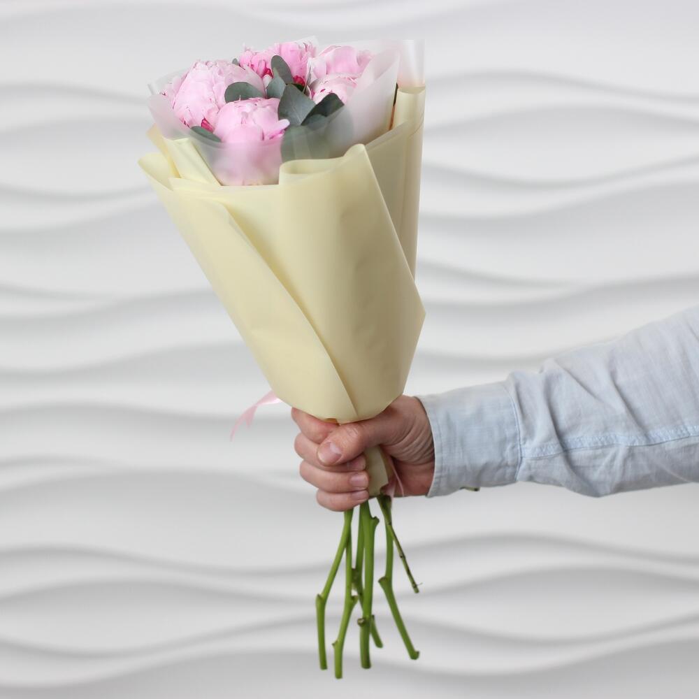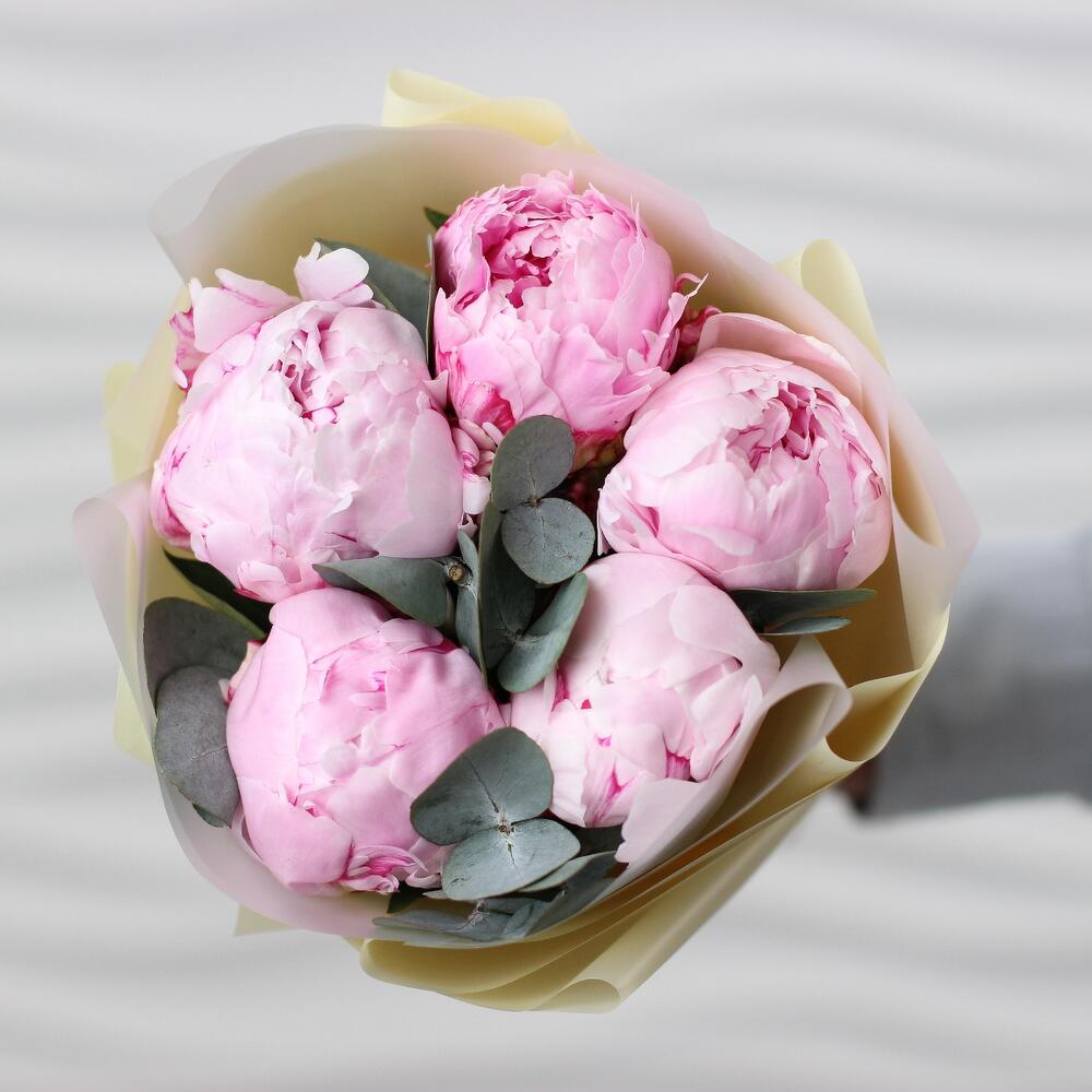 Ароматные розовые пионы с веточками эвкалипта в стильной непромокаемой упаковке. Такой букет всегда уместен и подойдёт для любого повода: День Рождения, именины, годовщина свадьбы, рождение ребенка, 8 марта, День Святого Валентина, выпускной и т.д. Можно вручить маме, сестре, подруге, коллеге, учителю, любимой.