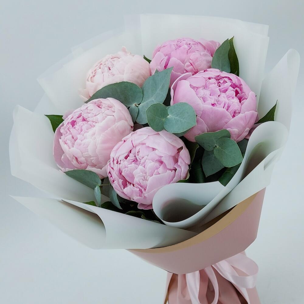 5 розовых пионов с эвкалиптом