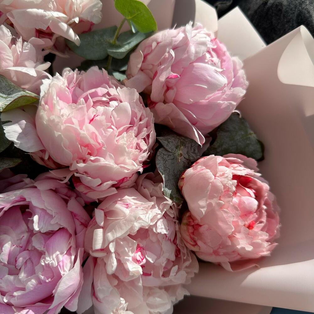 7 Пионов с эвкалиптом в дизайнерской упаковке