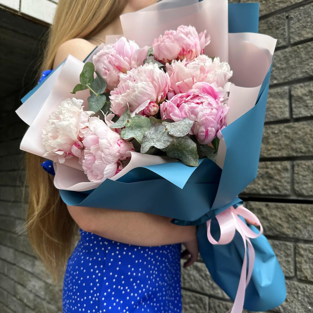 Пион - 7 шт. Эвкалипт - 4 шт. Лента атласная - 1 шт. Дизайнерская упаковка - 2 шт.