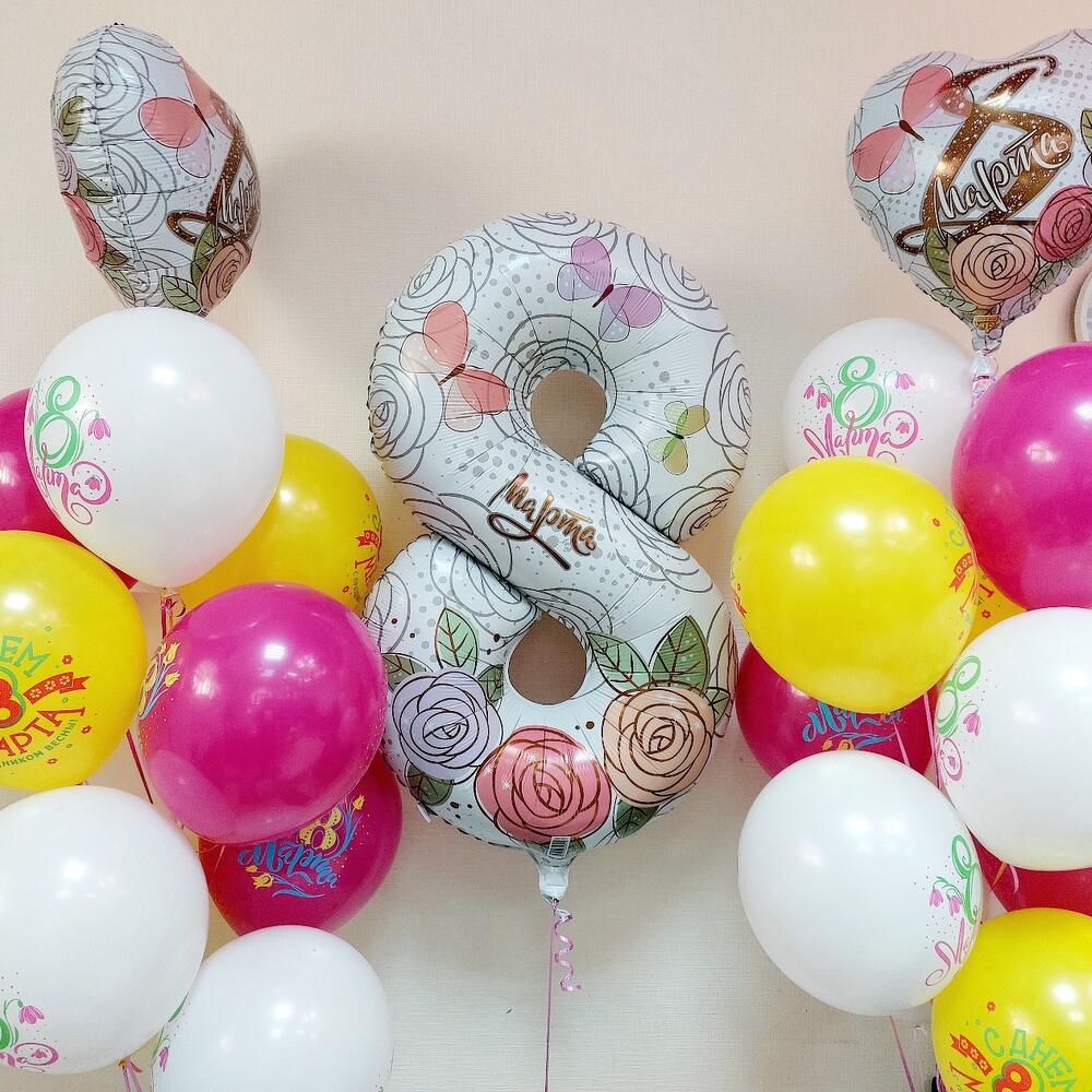 2 фонтана, в каждом:9 шаров из коллекции 8 марта, 1 фольгированный шар Цифра на грузике 🎈