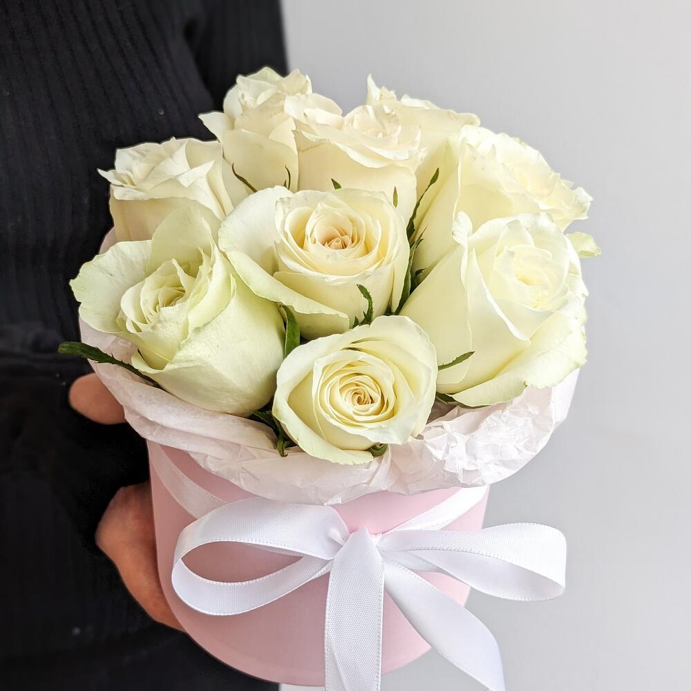 9 белых роз в коробке