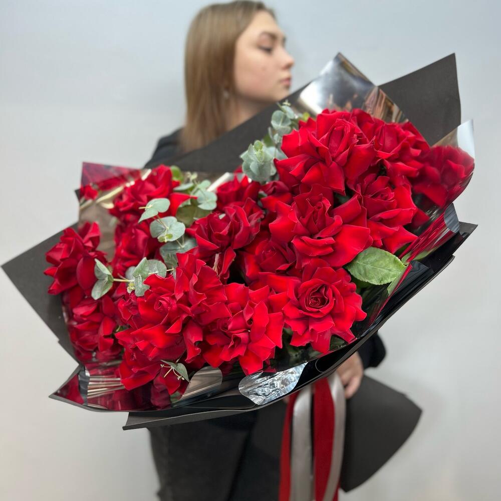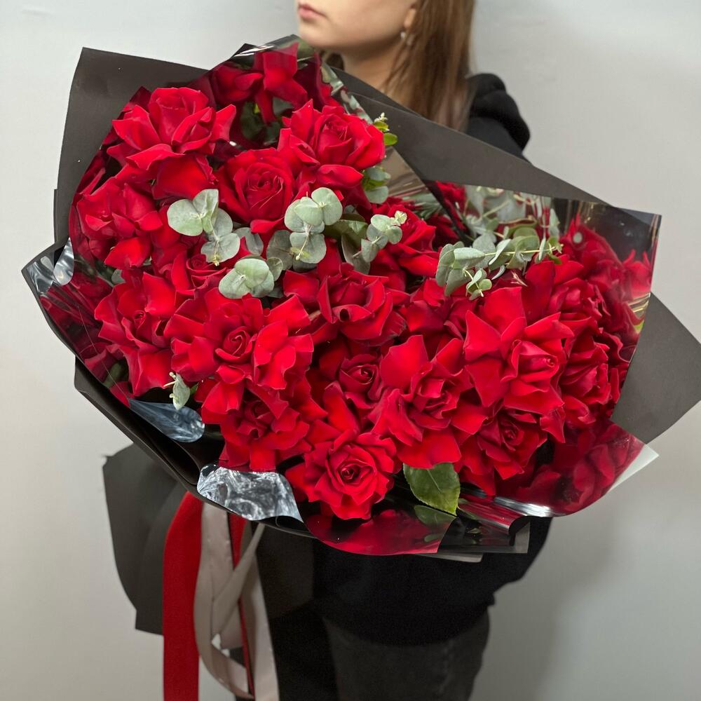 Роза Софи Лорен - 19 шт. Упаковка дизайнерская - 1 шт. Эвкалипт пучок - 1 шт.
