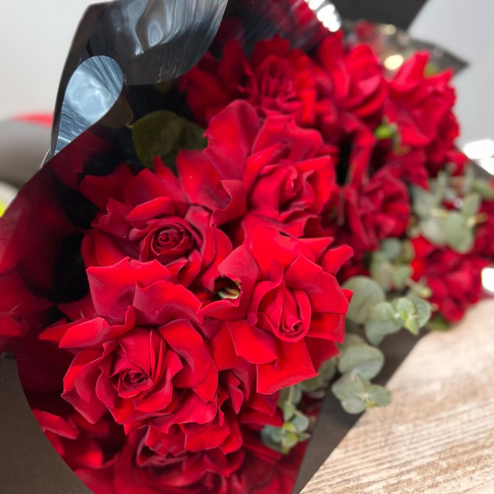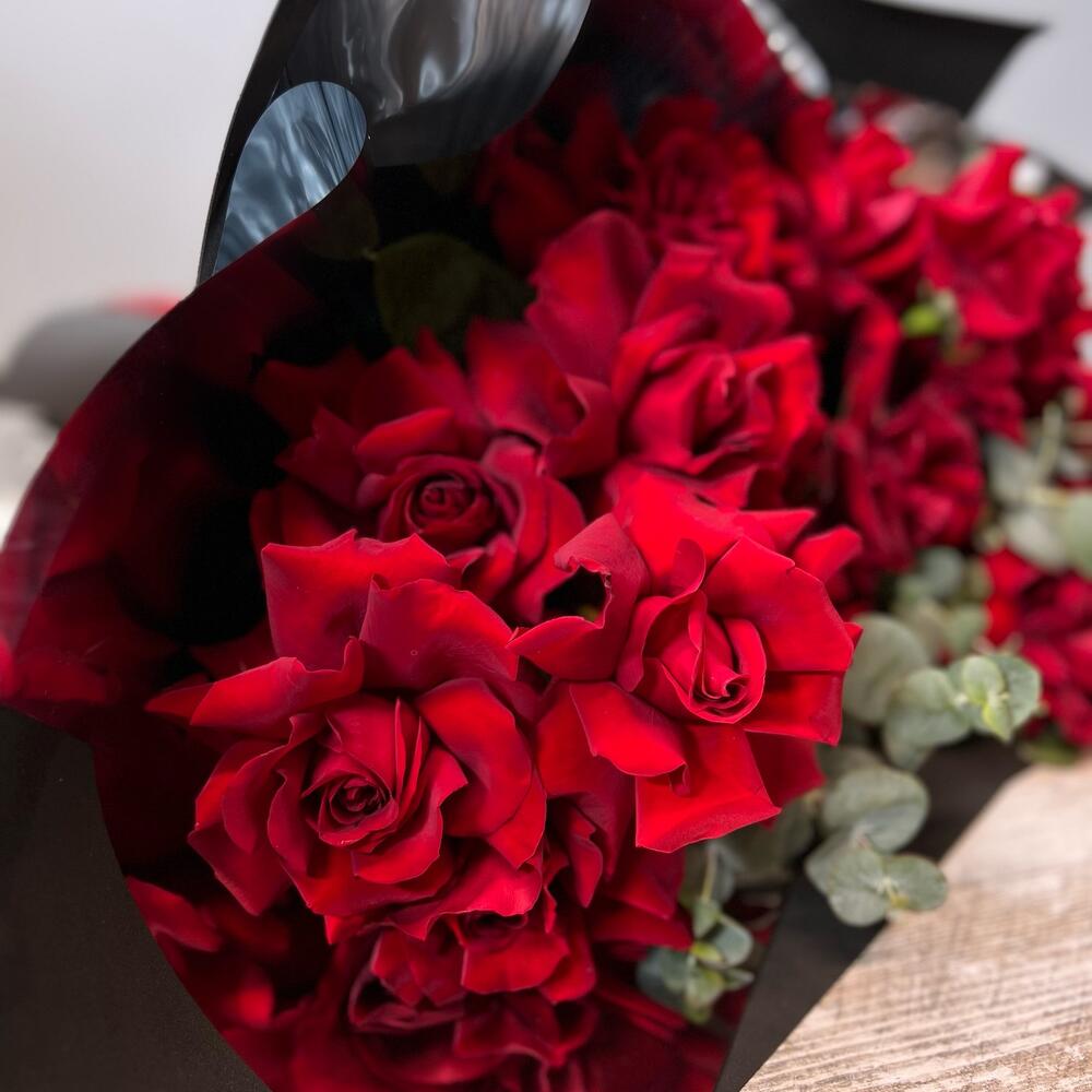 Шикарный букет из алых роз с ароматным эвкалиптом в стильной черной упаковке Букет из 19 эквадорских роз Софи Лорен отлично подойдет для того чтобы выразить свои чувства. Большой букет алых роз можно подарить на 14 февраля, 8 марта, День Влюбленных, День рождения или юбилейКрасные розы премиум в черной упаковке можно заказать на доставку в Нижнем Новгороде