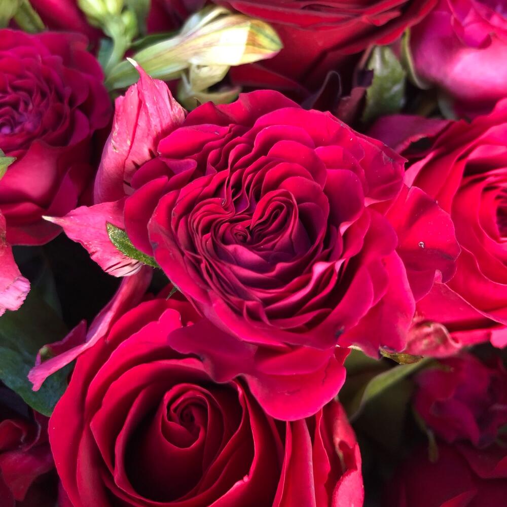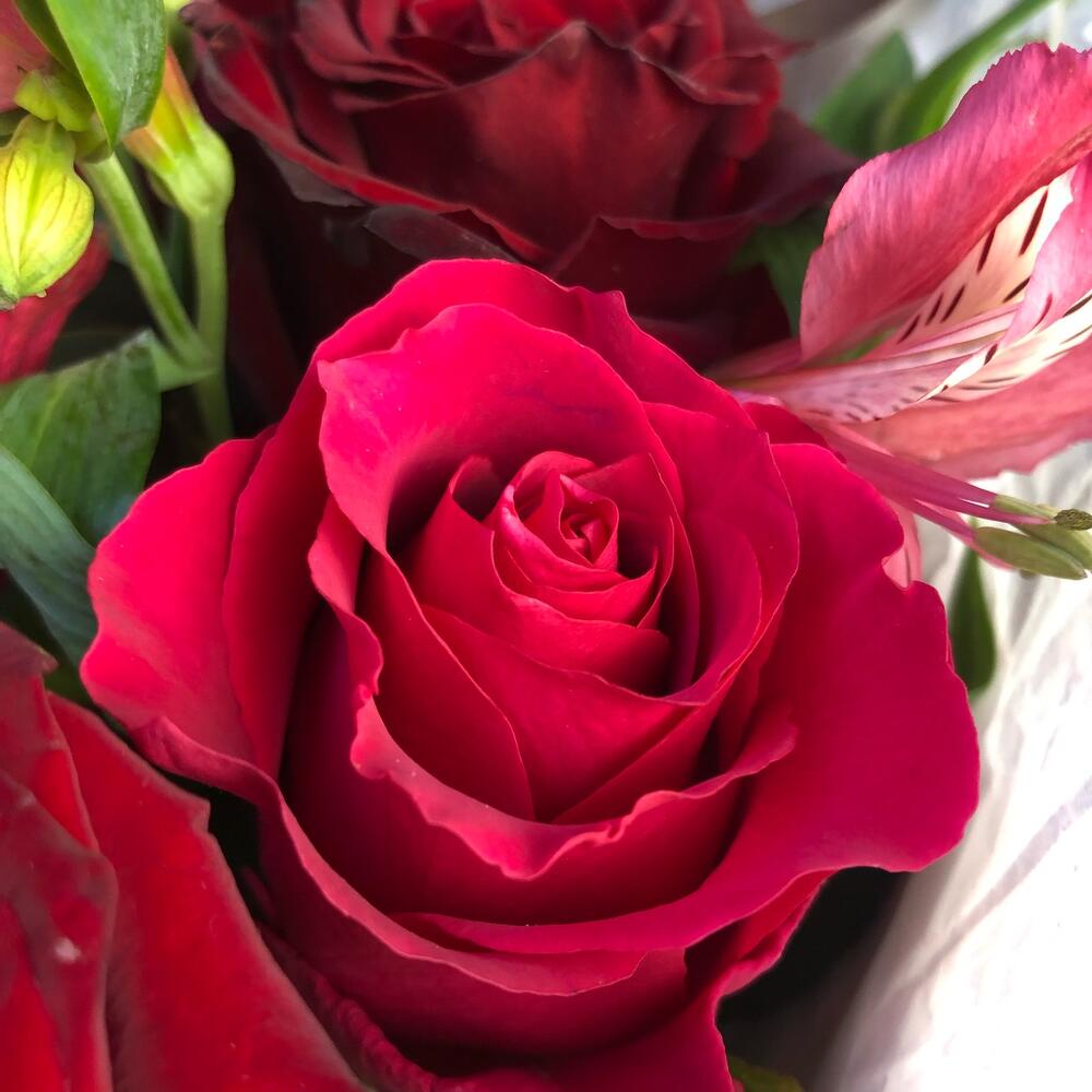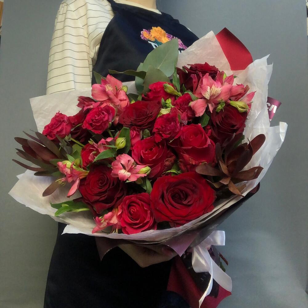 Яркий букет из бордовых и розовых эквадорских роз с добавлением альстромерии, кустовой розы, эвкалипта и леукадендрона.
