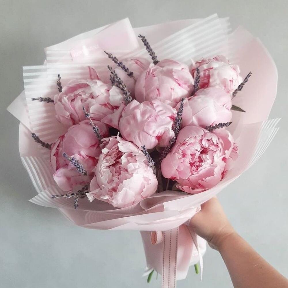 Лаванда (сухоцвет) – 15 шт. Оформление – 1 шт. пионы сара бернар – 9 шт.