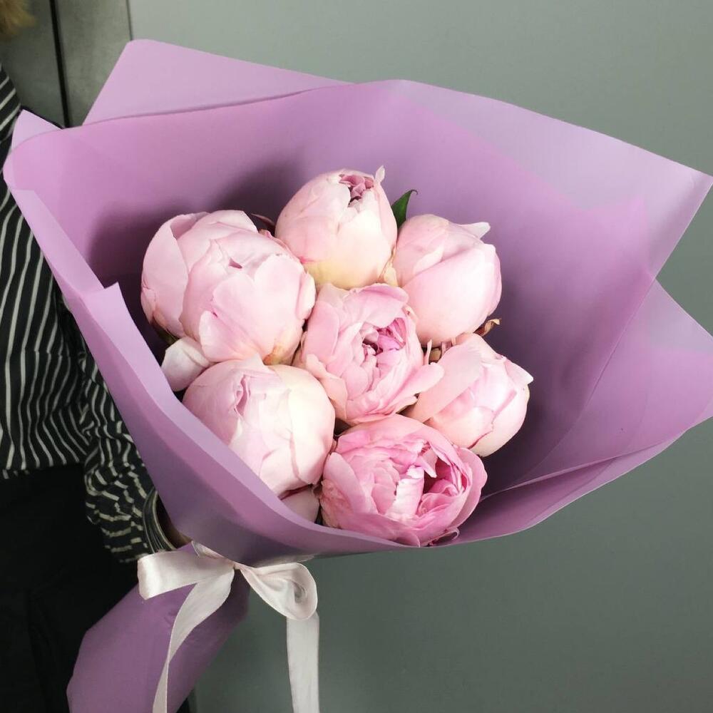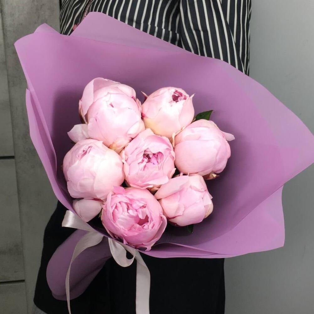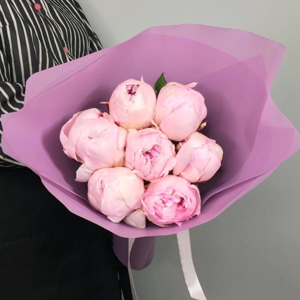 Атласная лента – 1 шт. Дизайнерская упаковка – 1 шт. пионы – 7 шт.
