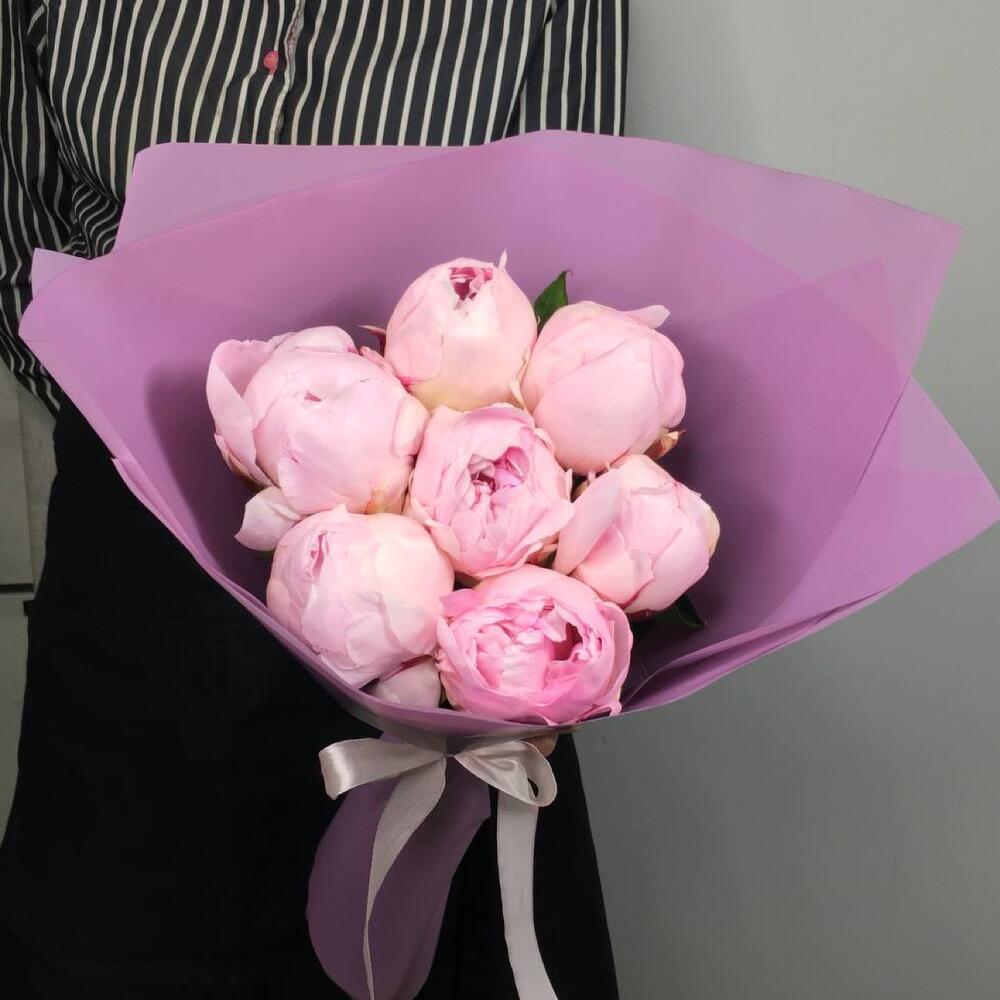 Атласная лента - 1 шт. Дизайнерская упаковка - 1 шт. пионы - 7 шт.