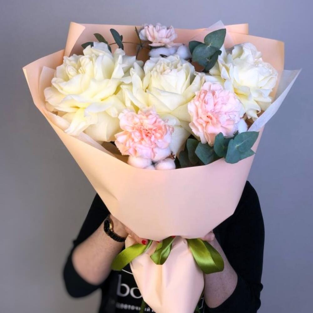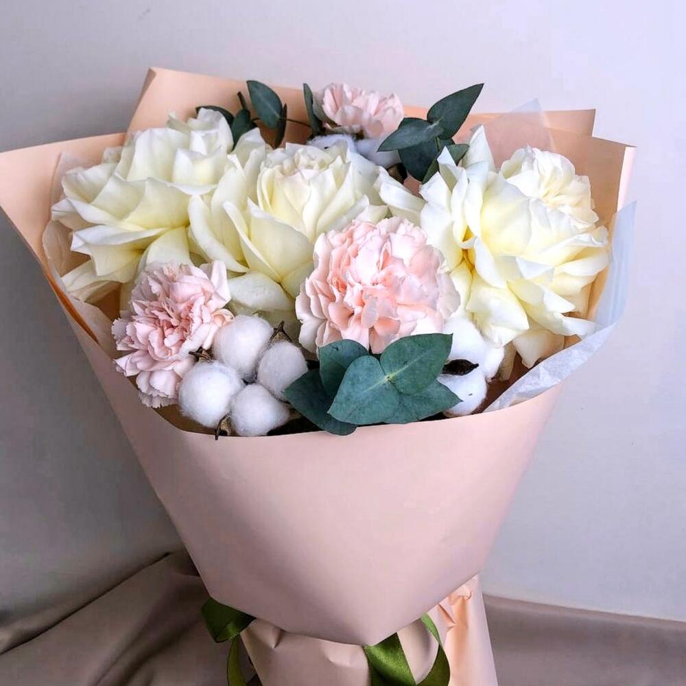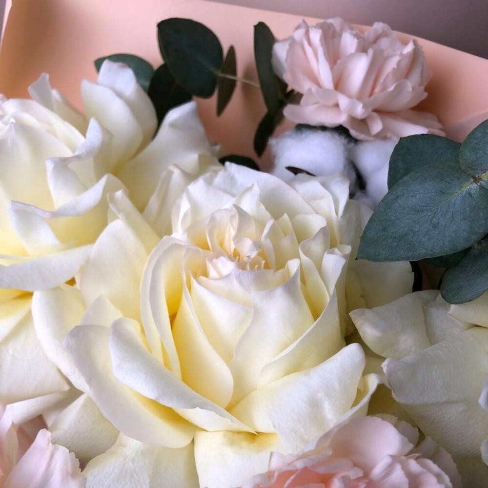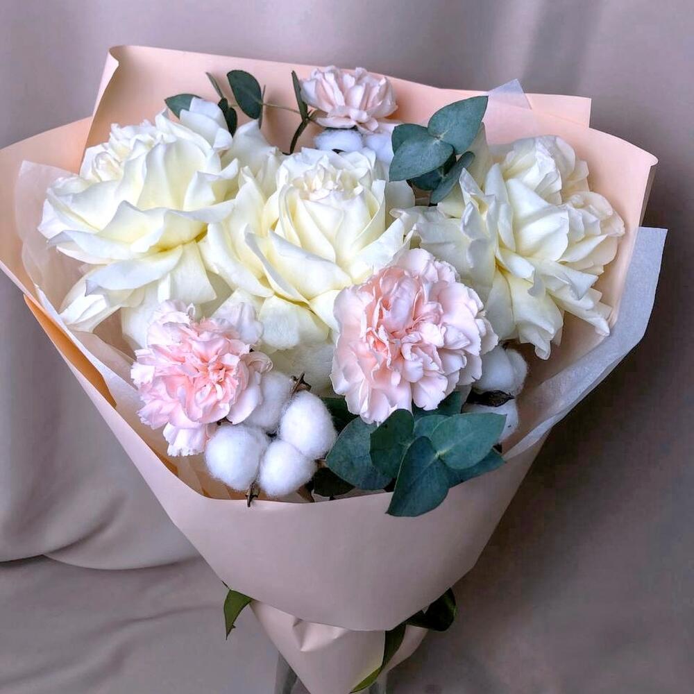 Хлопок – 3 шт. Эвкалипт – 3 шт. Гвоздика – 3 шт. Лента атласная – 1 шт. флористическая пленка – 1 шт. роза французская белая – 3 шт. подкормка для стойкости цветов – 1 шт. открытка для пожеланий – 1 шт.