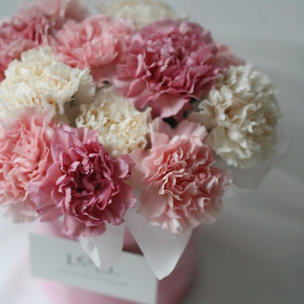 Гвоздика – 13 шт. Пена флористическая – 1 шт. бокс бархатный 12х12 – 1 шт.