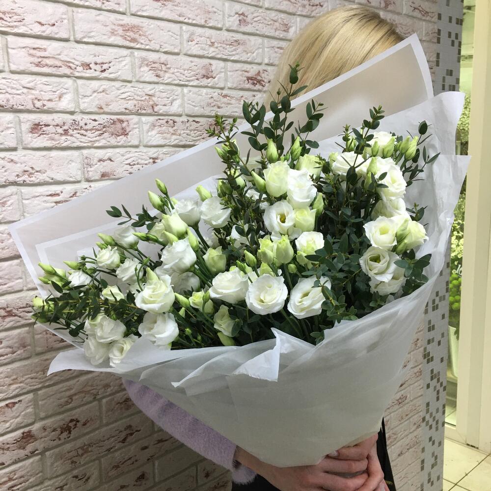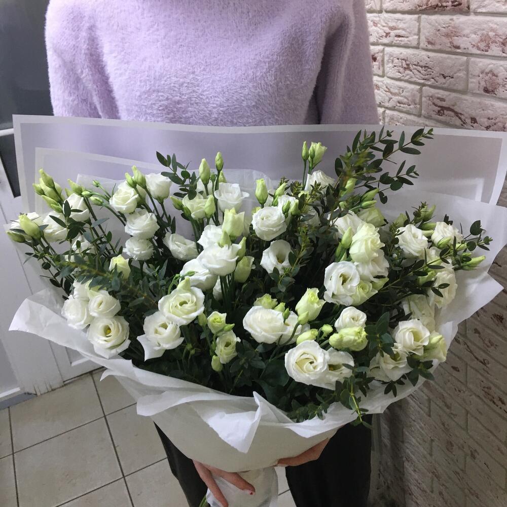 Лента атласная – 1 шт. Лизиантус белый – 15 шт. Упаковка дизайнерская – 2 шт. Эвкалипт Парвифолио – 4 шт.