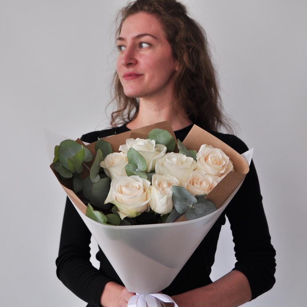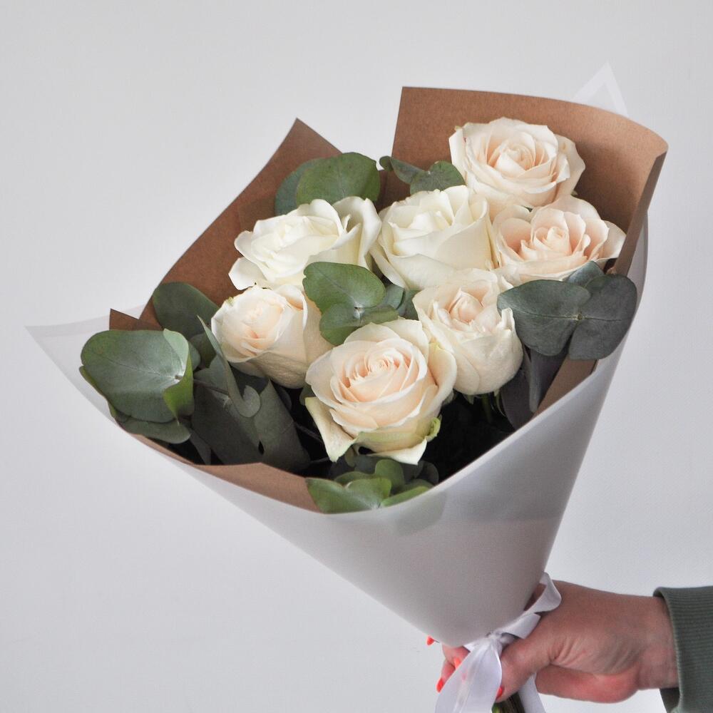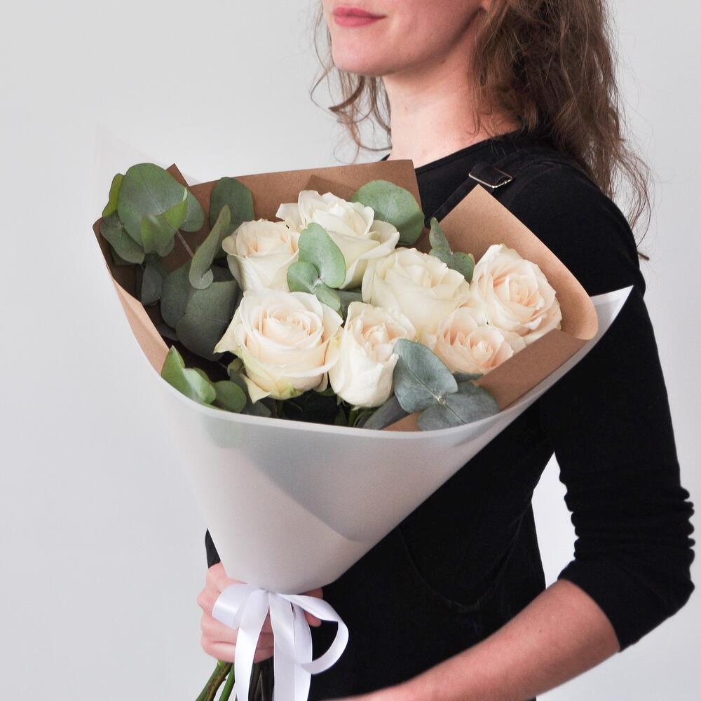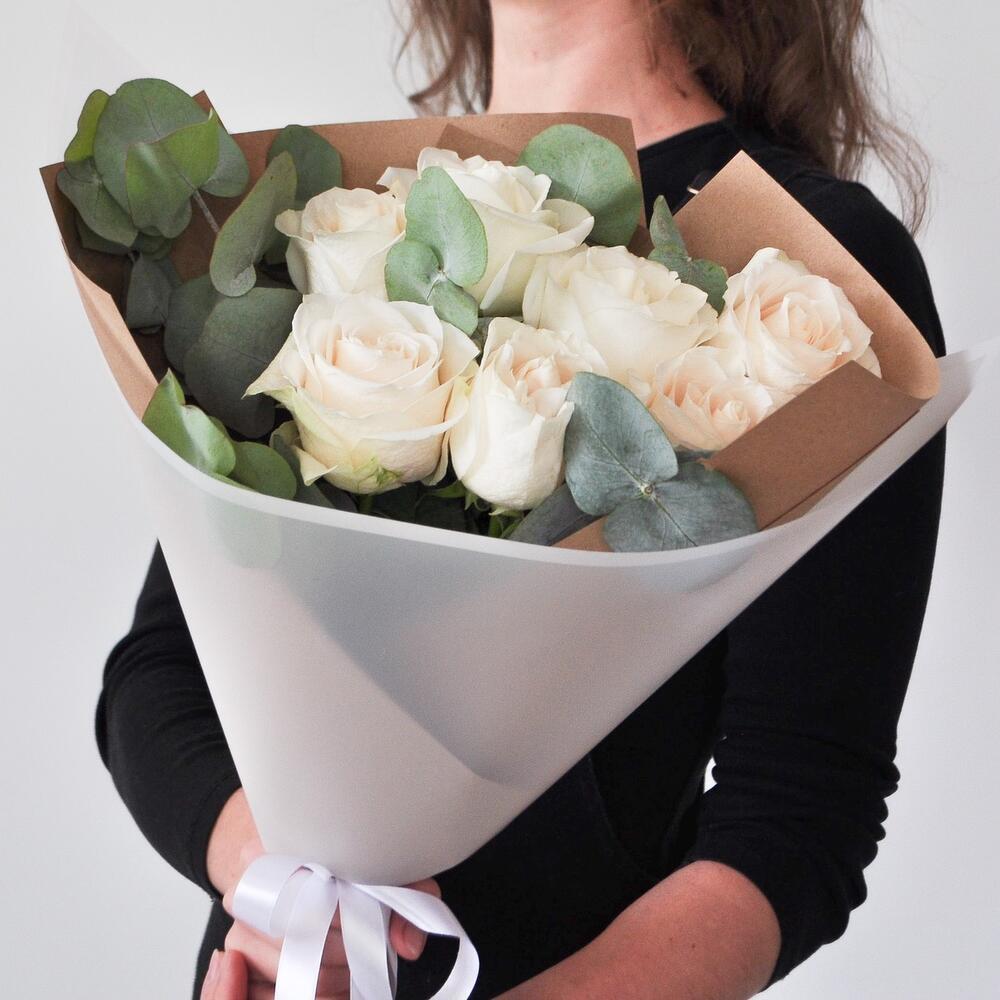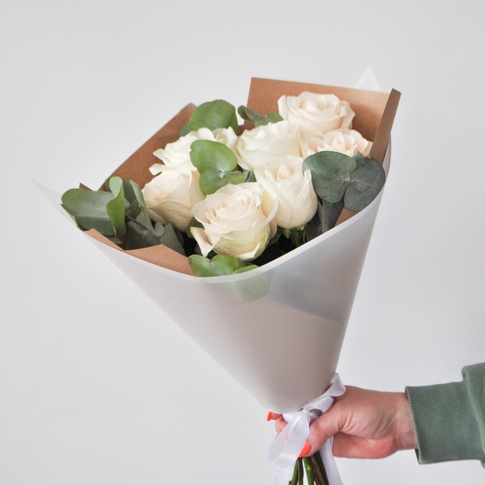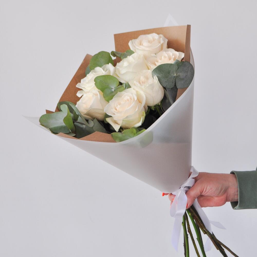 Изящный букет из эквадорских крупных белых роз. Эвкалипт дарит букету воздушность и легкость, а крафтовая бумага подчеркивает хрупкость и нежность белоснежных лепестков✨Если Вы еще не знаете, что подарить любимой девушке, маме, учителю, бабушке или сестре, то этот букет станет отличным комплиментом, признанием или проявлением чувств!Данный букет подойдет на такие торжественный события, как: 1 сентября, день матери, день рождения, крестины, рождение ребенка, предложение руки и сердца!