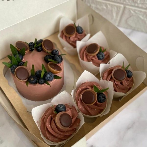 Набор бенто-торт и капкейки с начинкой “Сникерс” состоит из шоколадного бисквита, нежнейшей сливочной карамели с соленым арахисом и сливочно-творожным кремом. Задекорированные свежей голубикой с тоффифи.
