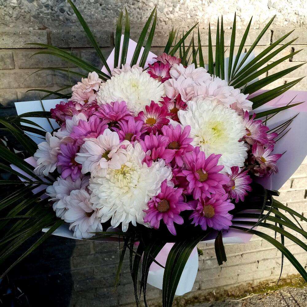 Лента - 1 шт. Хризантема кустовая - 10 шт. Пальма - 4 шт. Пленка матовая - 1 шт. магнум белый - 3 шт.