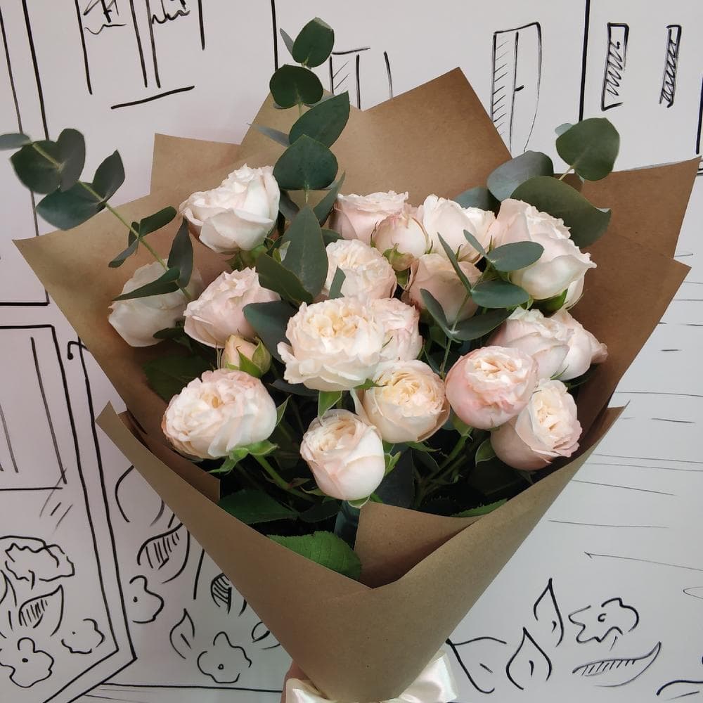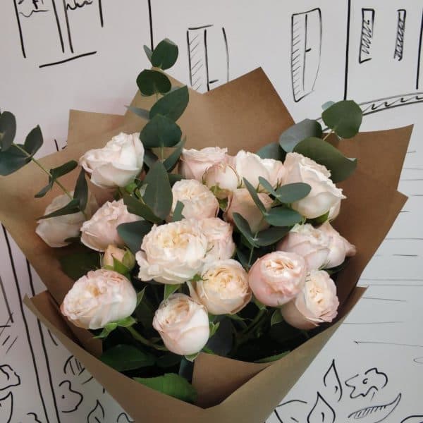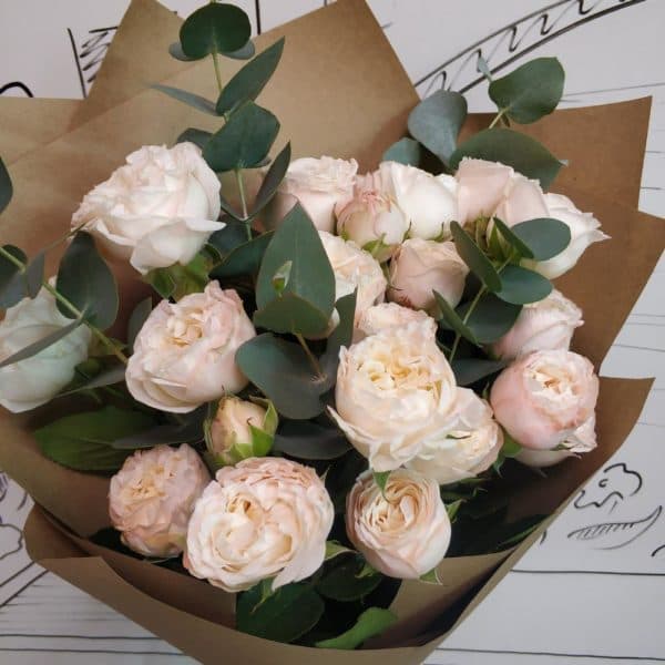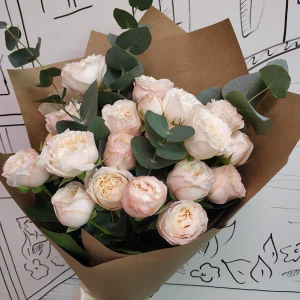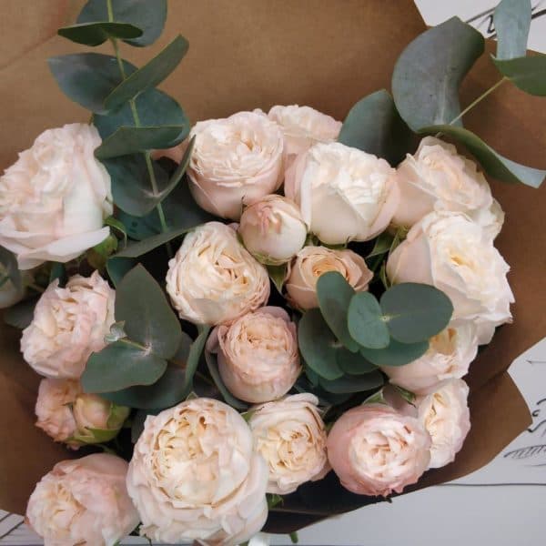Роза кустовая пионовидная - 7 шт.Эвкалипт - 2 шт.Упаковка крафт - 1 шт.