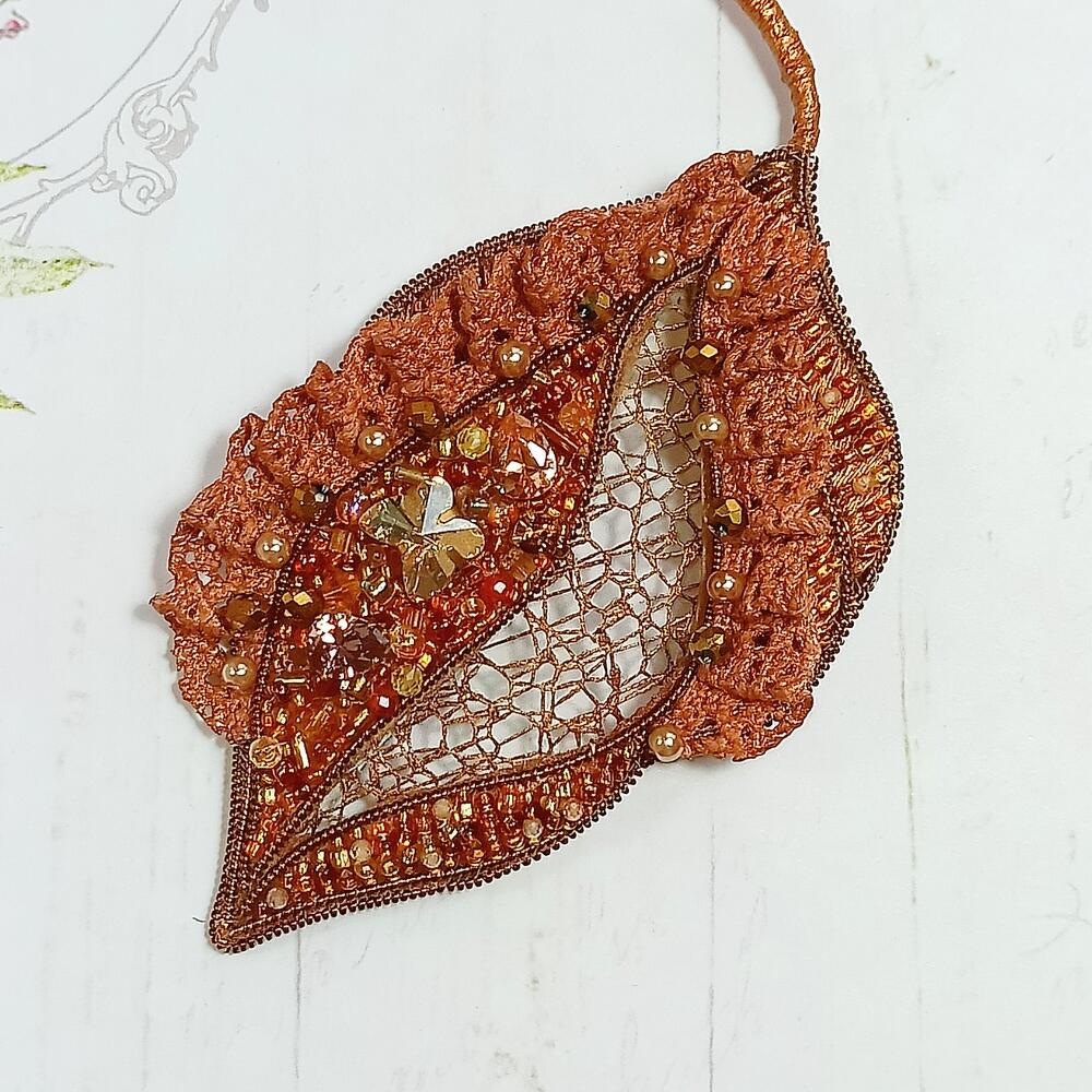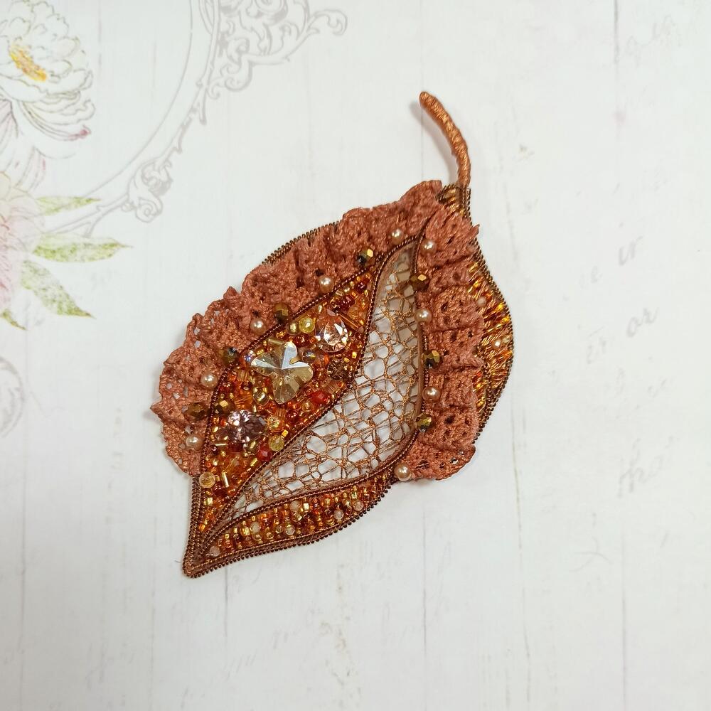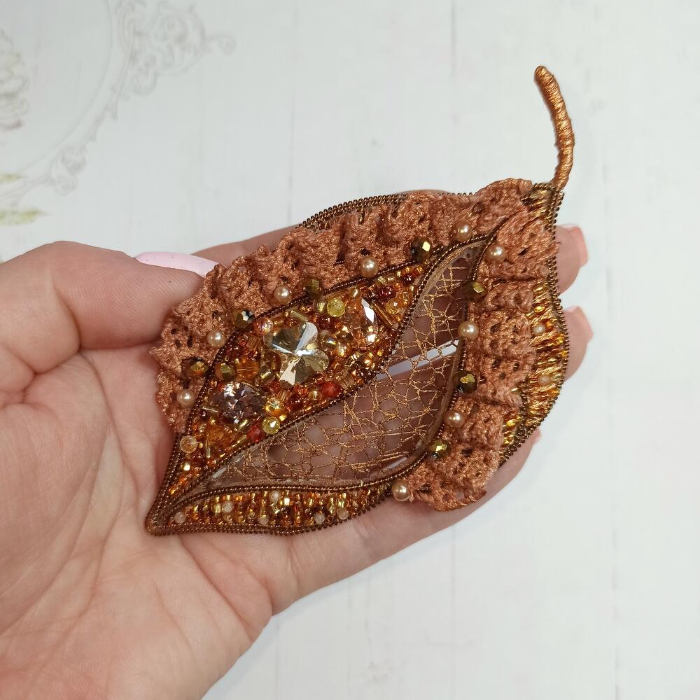 Брошь “Листик” вышита вручную в бронзово-золотистых тонах бисером, бусинами, цирконами. Размер изделия: В-9 см., Ш-5,5 см.