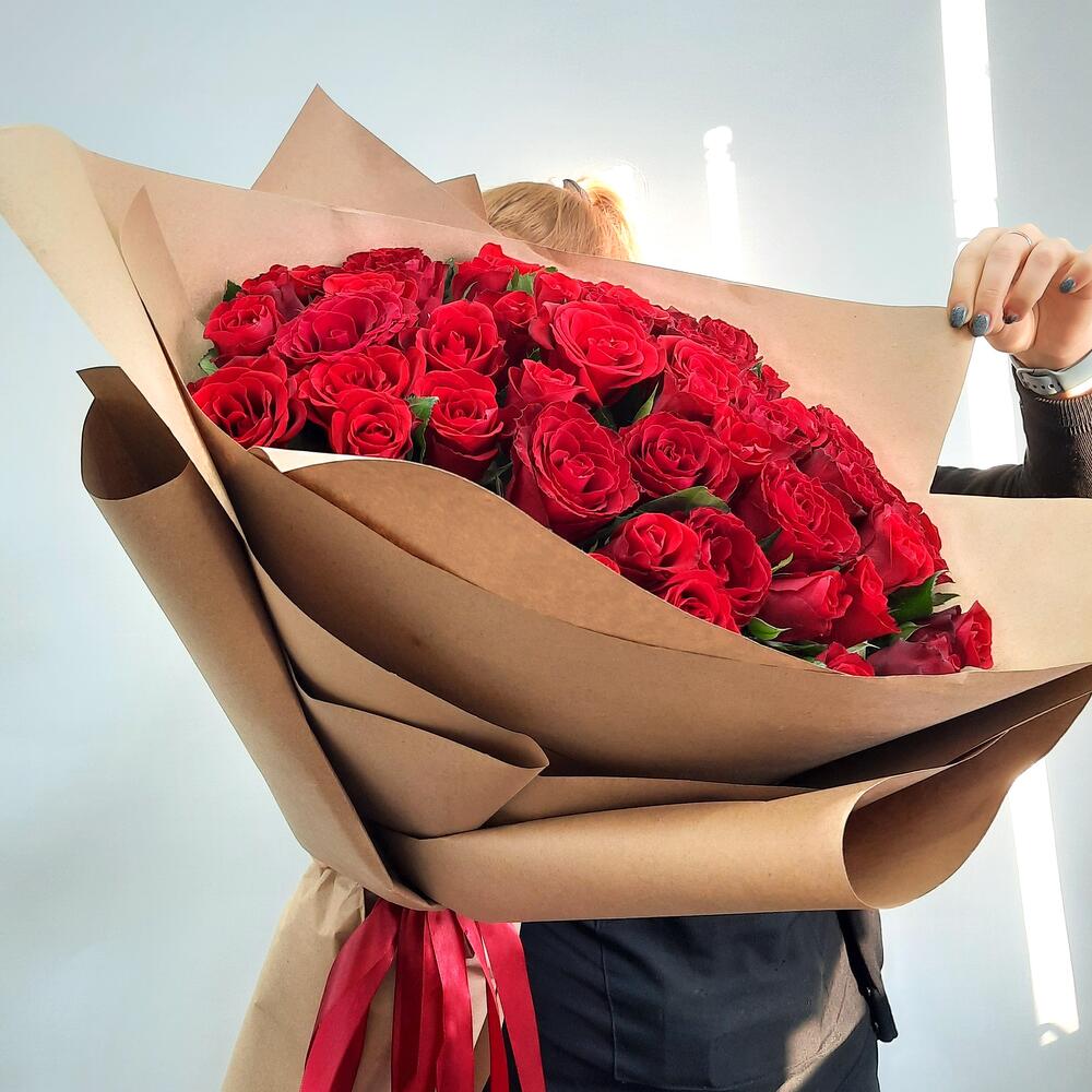 Роза - 51 шт. Лента атласная - 1 шт. Крафт бумага - 1 шт.