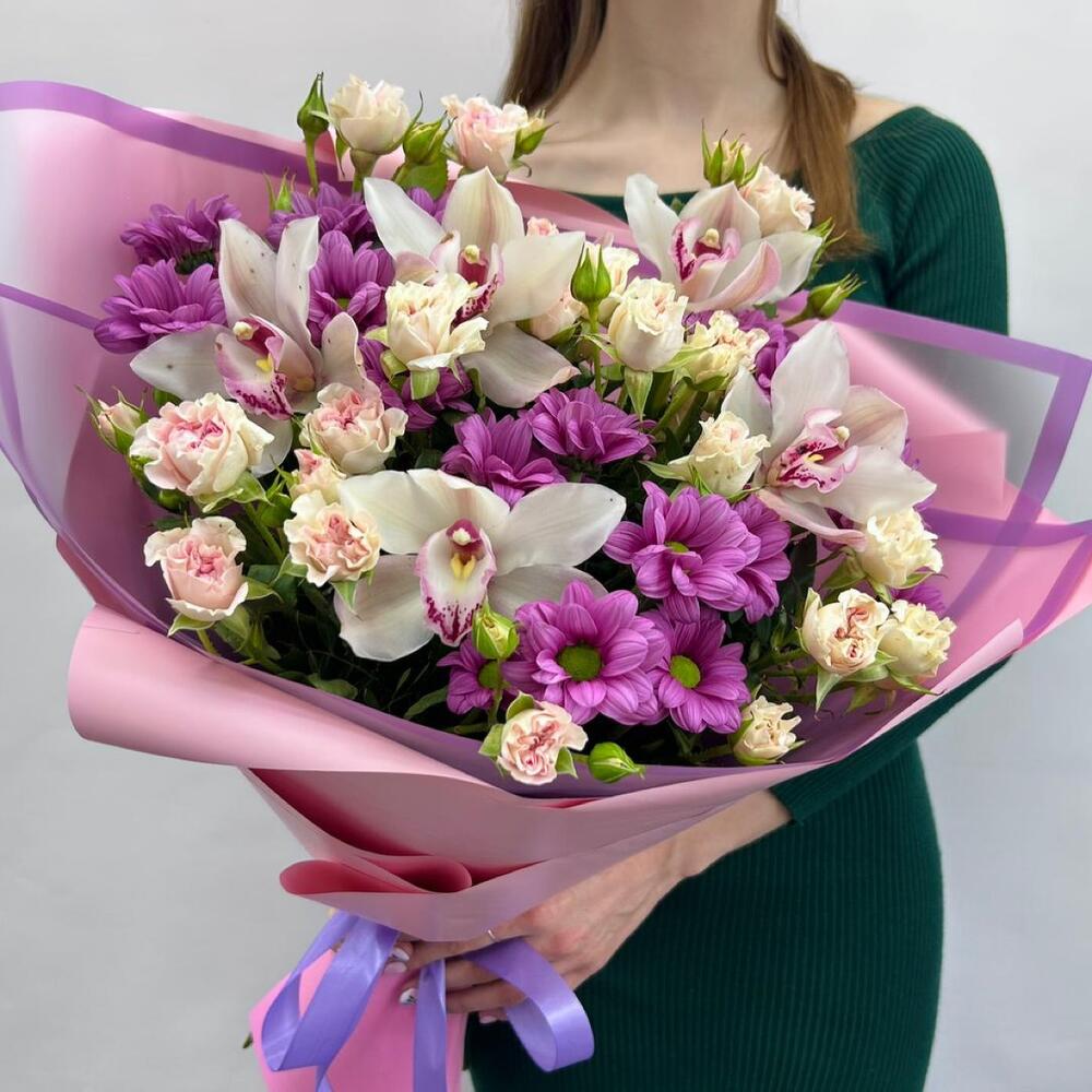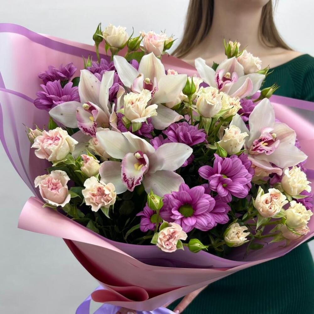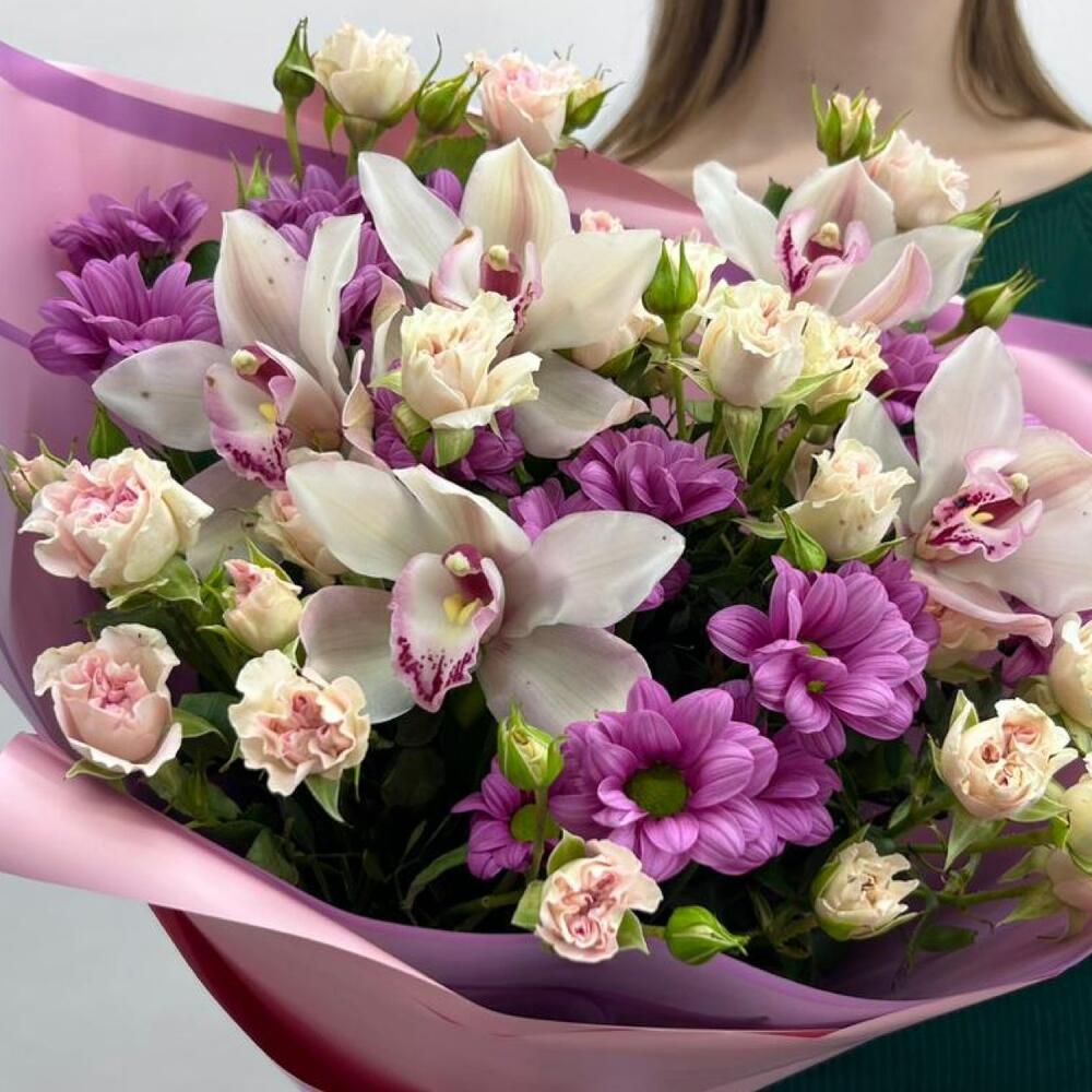 Авторский букет с сочетанием таких цветов как: орхидея цимбидиум, кустовая роза, кустовая хризантема, в красивом оформлениии матовой пленкой.