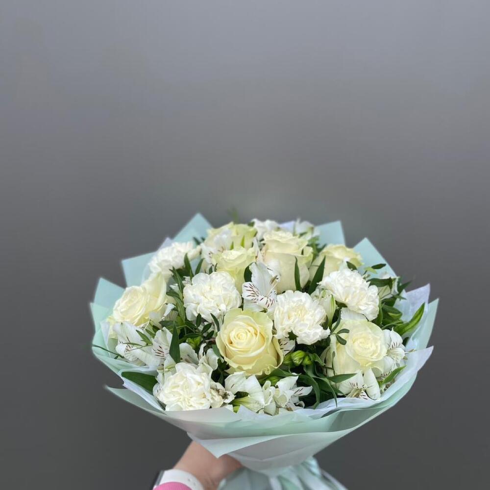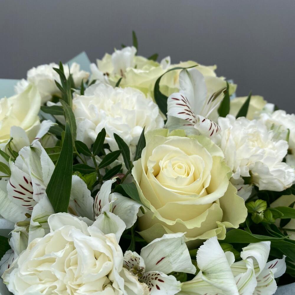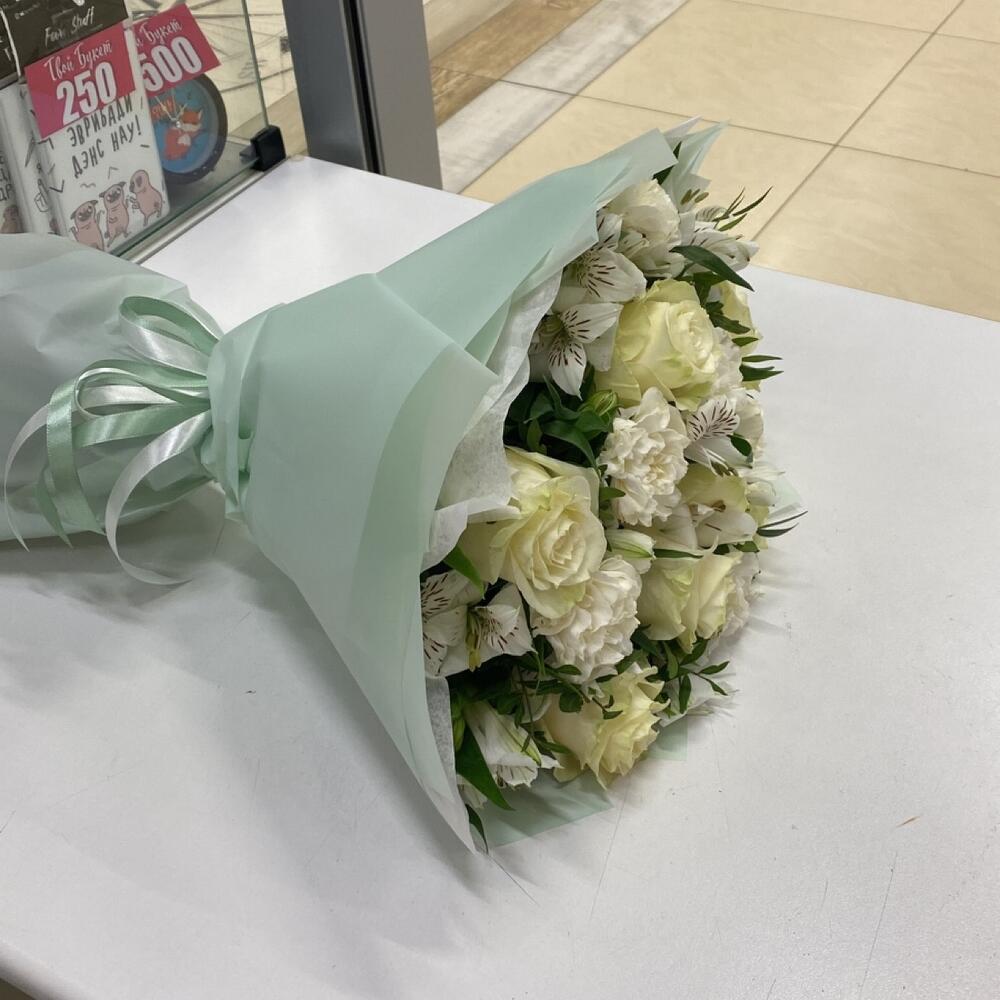 Альстромерия – 6 шт. Лента атласная – 1 шт. Тишью – 2 шт. Упаковка дизайнерская – 1 шт. роза эквадор 60 см белая – 7 шт. фисташка зелень – 6 шт. диантусы сортовые – 6 шт. крезал для воды – 1 шт.