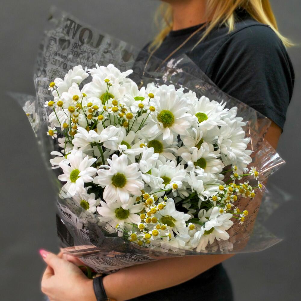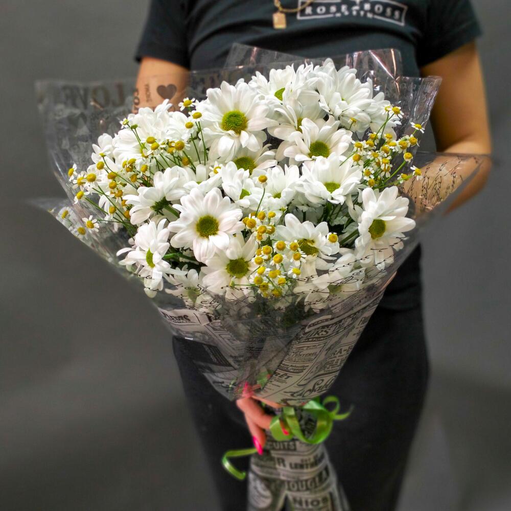 Танацетум – 3 шт. Хризантема – 5 шт. лента декоративная – 2 шт. пленка декоративная – 1 шт.