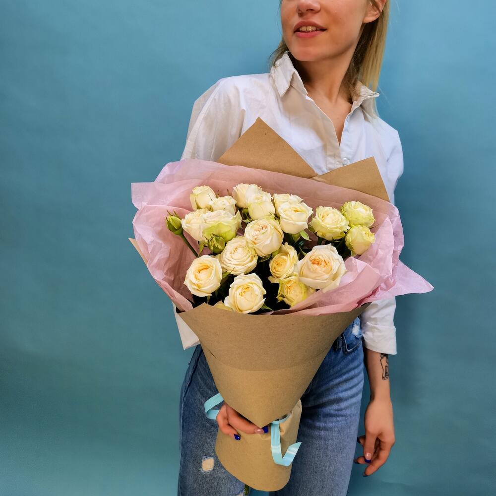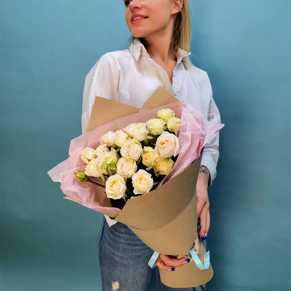 Лента атласная - 1 шт. Тишью - 1 шт. Роза спрей - 5 шт. Дизайнерская упаковка - 1 шт.