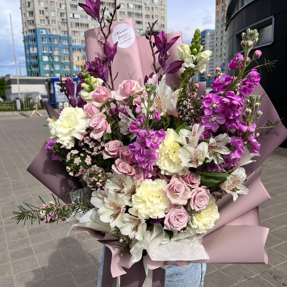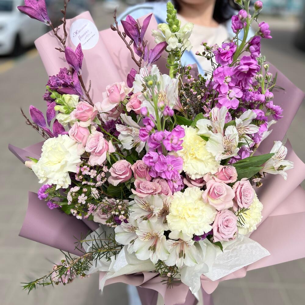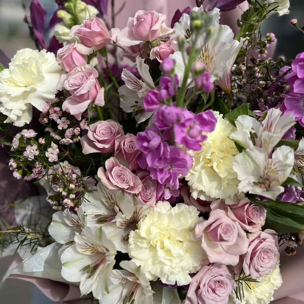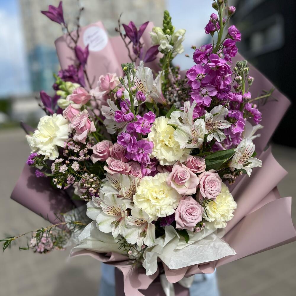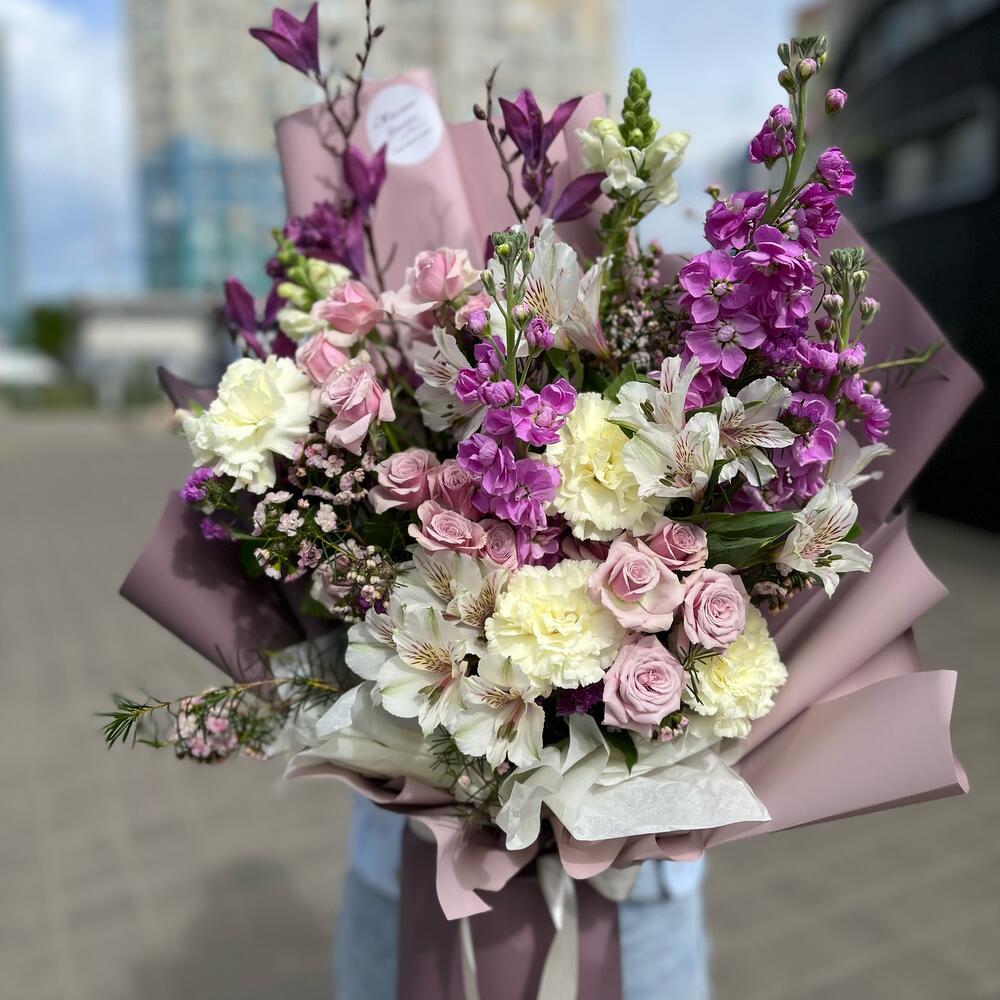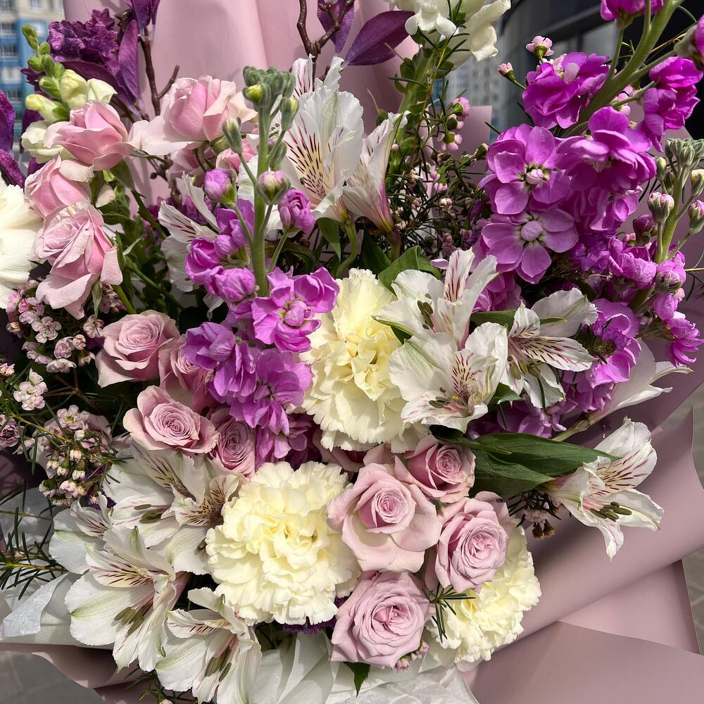 Альстромерия - 4 шт. Маттиола - 5 шт. Роза кустовая - 4 шт. Зелень - 5 шт. Упаковка - 2 шт. Лента атласная - 1 шт. Тишью - 1 шт. Диантус - 5 шт.