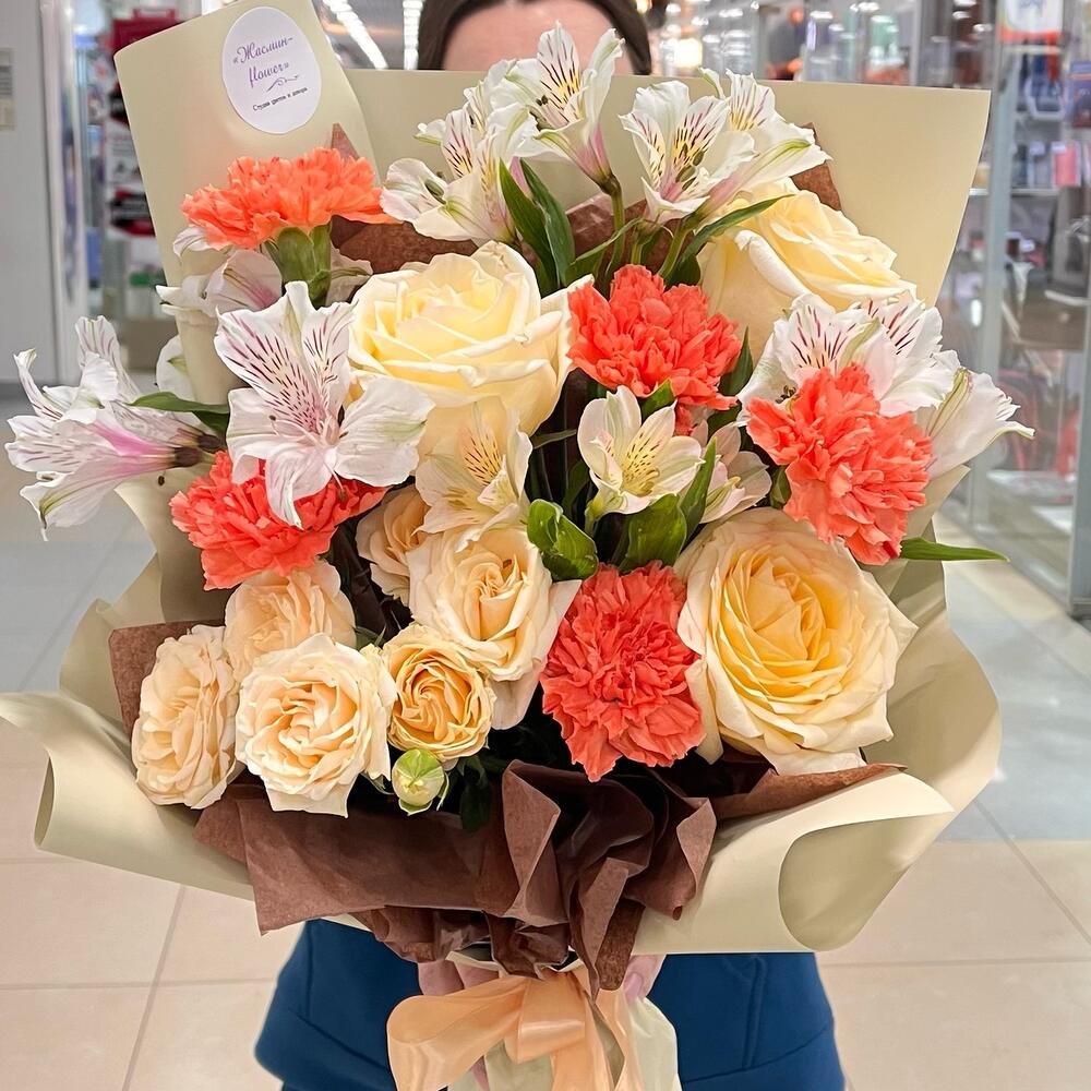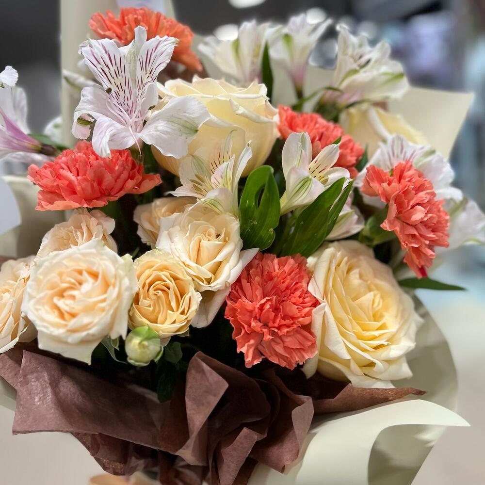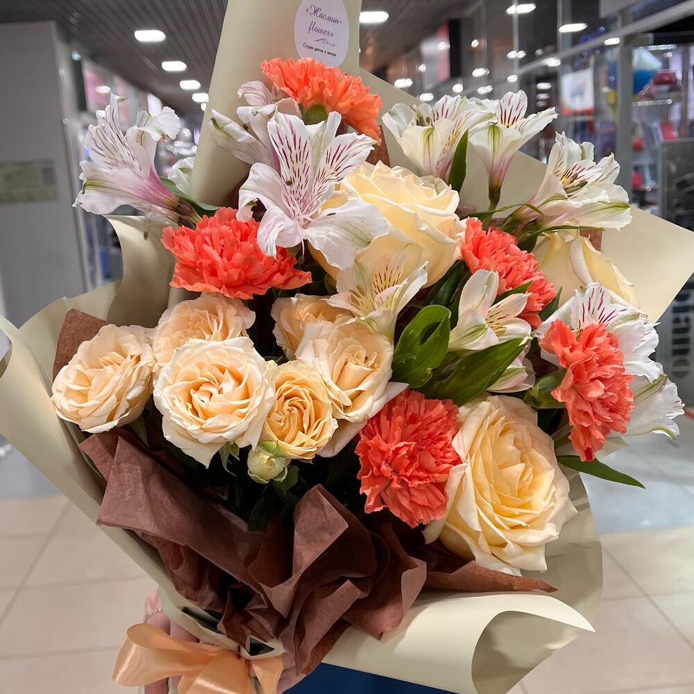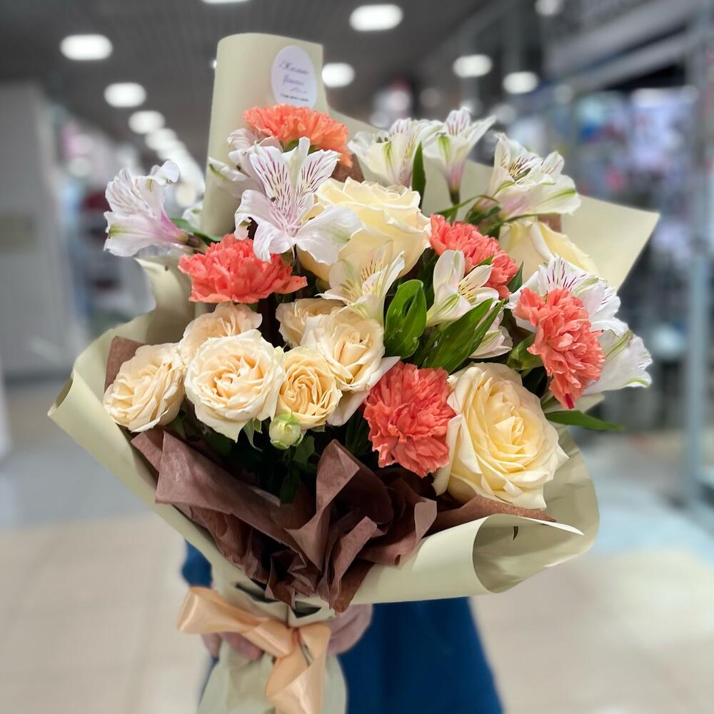 Альстромерия - 2 шт. Роза кустовая - 2 шт. Роза - 3 шт. Зелень - 2 шт. Упаковка - 2 шт. Лента атласная - 1 шт. Диантус - 5 шт.