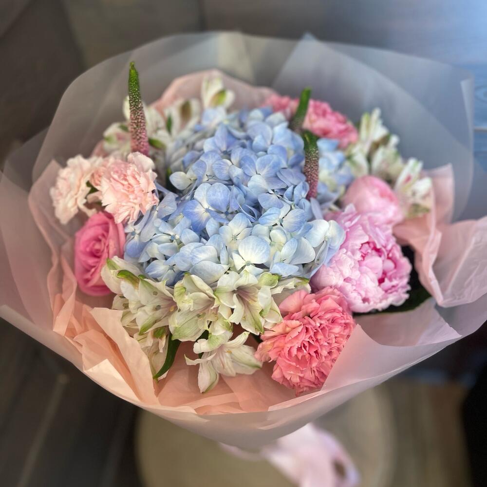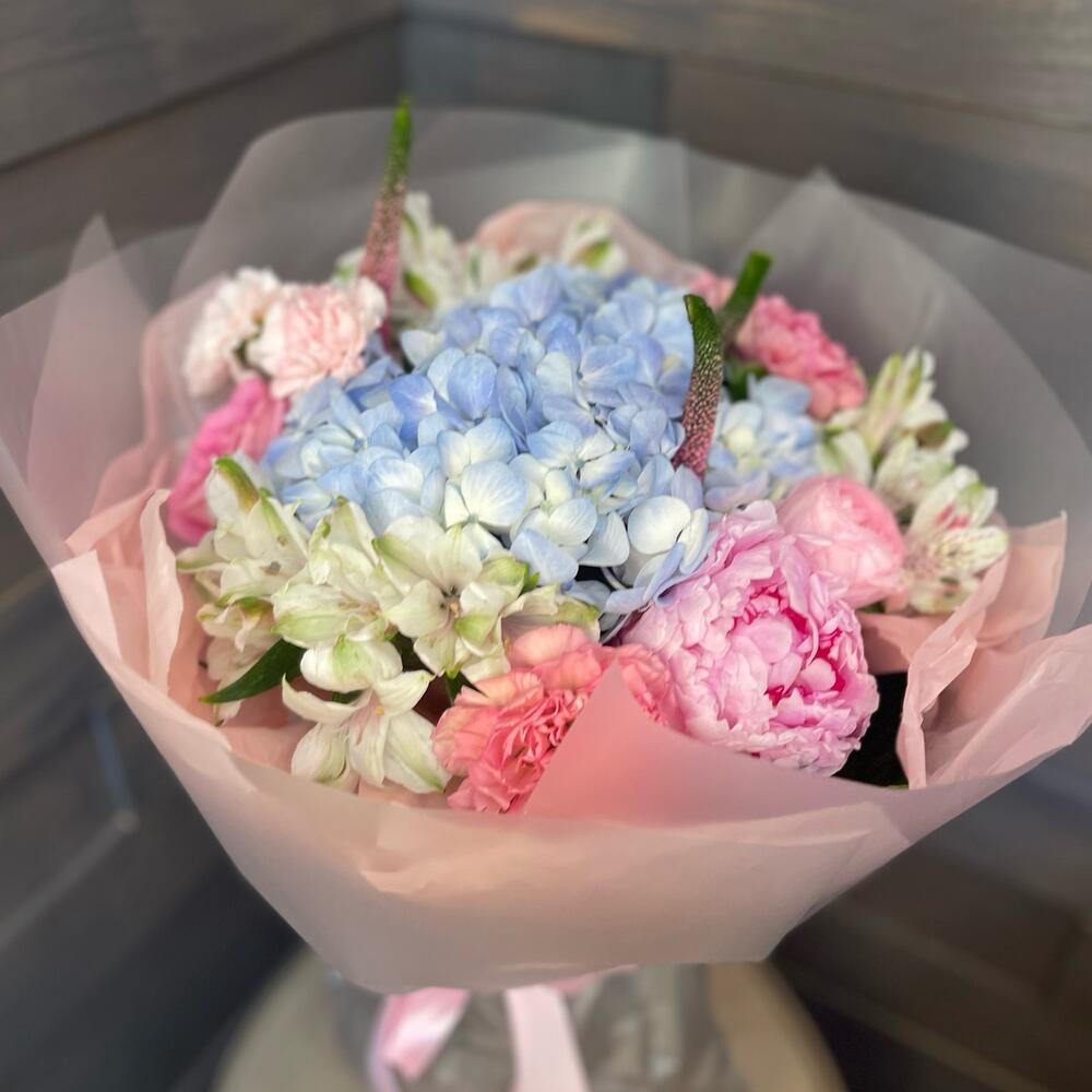Альстромерия - 3 шт. Вероника - 3 шт. Гортензия - 1 шт. Тюльпан - 3 шт. Хризантема кустовая - 3 шт. Упаковка - 1 шт. Лента атласная - 1 шт.