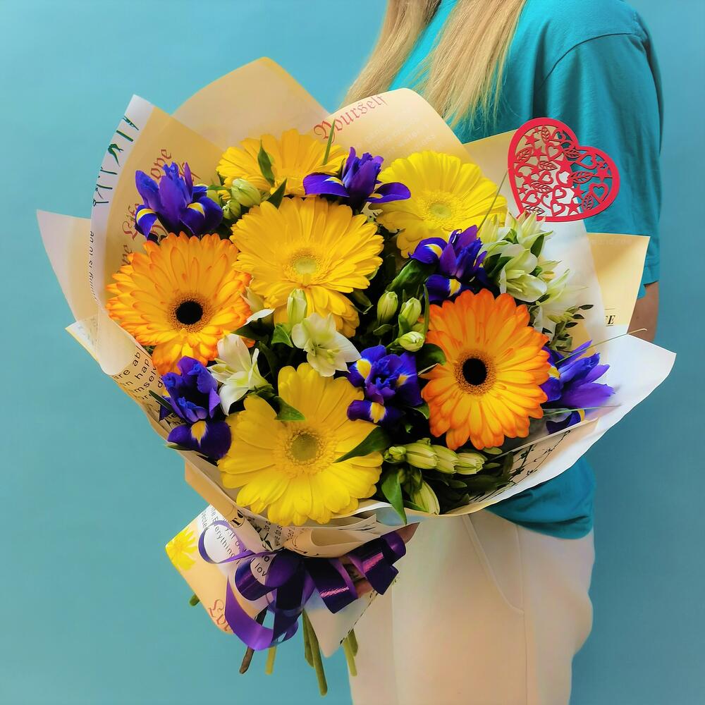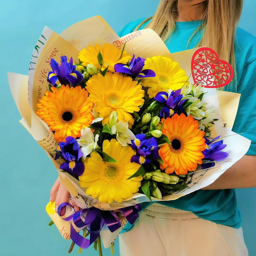 Альстромерия – 5 шт. Лента – 1 шт. Гербера – 6 шт. Пленка – 2 шт. Фисташка – 5 шт. Топпер – 1 шт. ирис микс – 7 шт.