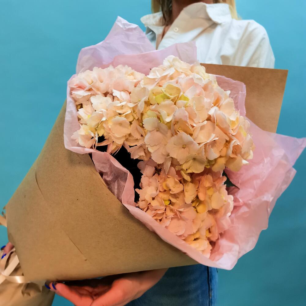 Гортензия - 3 шт. Лента - 1 шт. Тишью - 2 шт. Дизайнерская упаковка - 1 шт.