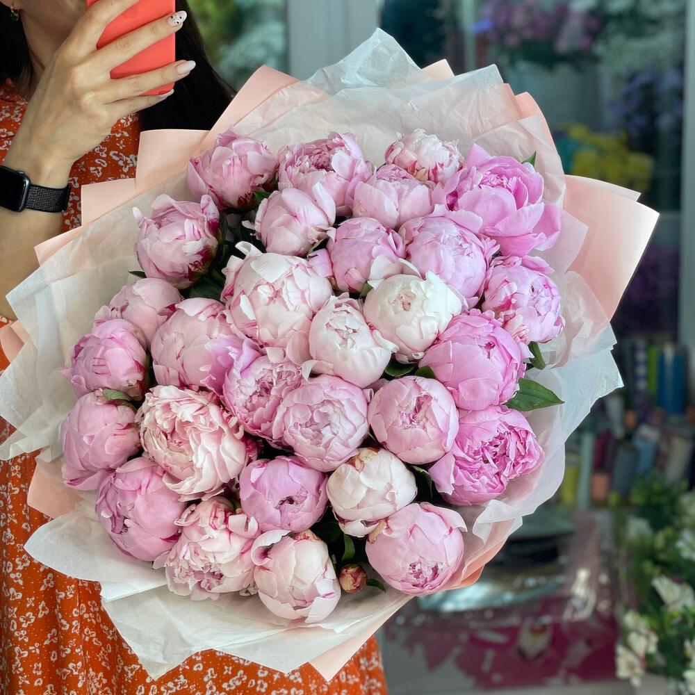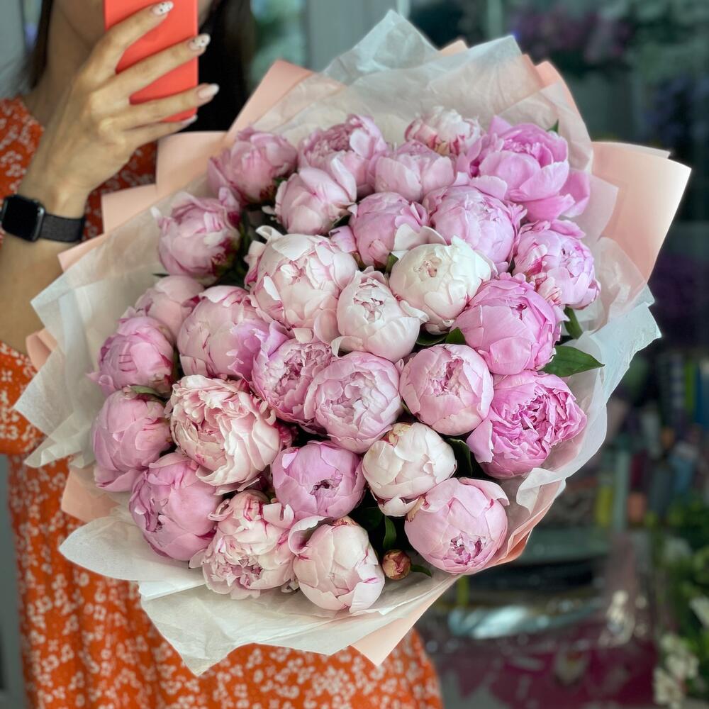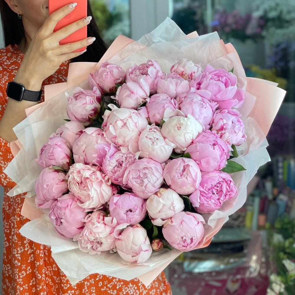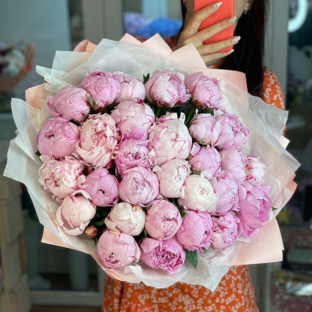 Лента атласная – 2 шт. Упаковка дизайнерская – 1 шт. Средство для продления жизни цветов – 2 шт. пионы сара бернар голландия – 29 шт.