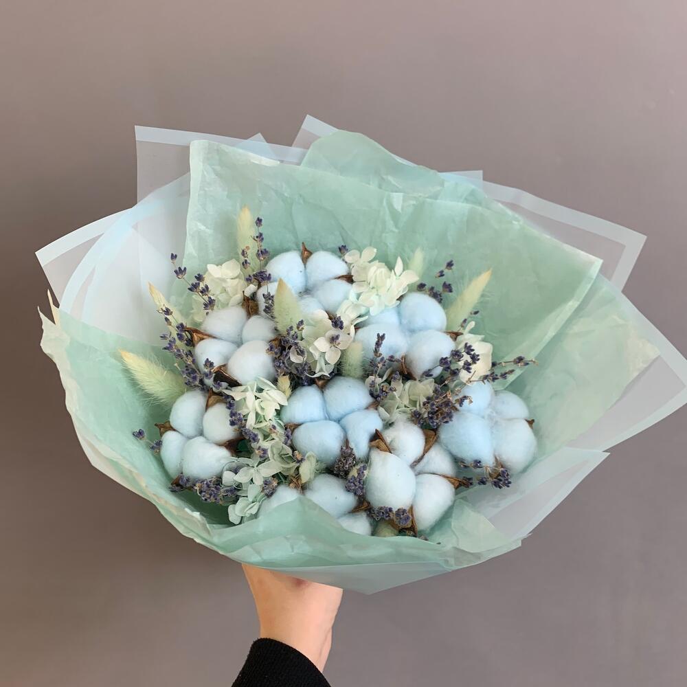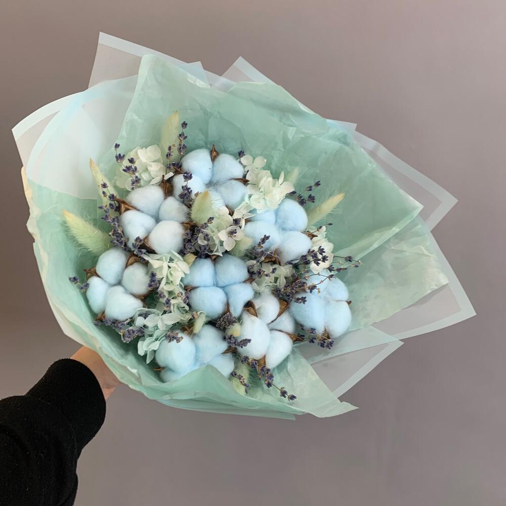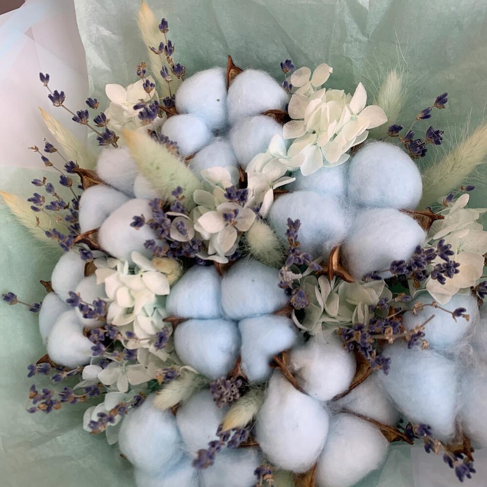 Гортензия - 1 шт. Лаванда - 1 шт. Хлопок - 8 шт. Упаковка - 1 шт. Лагурус - 11 шт.