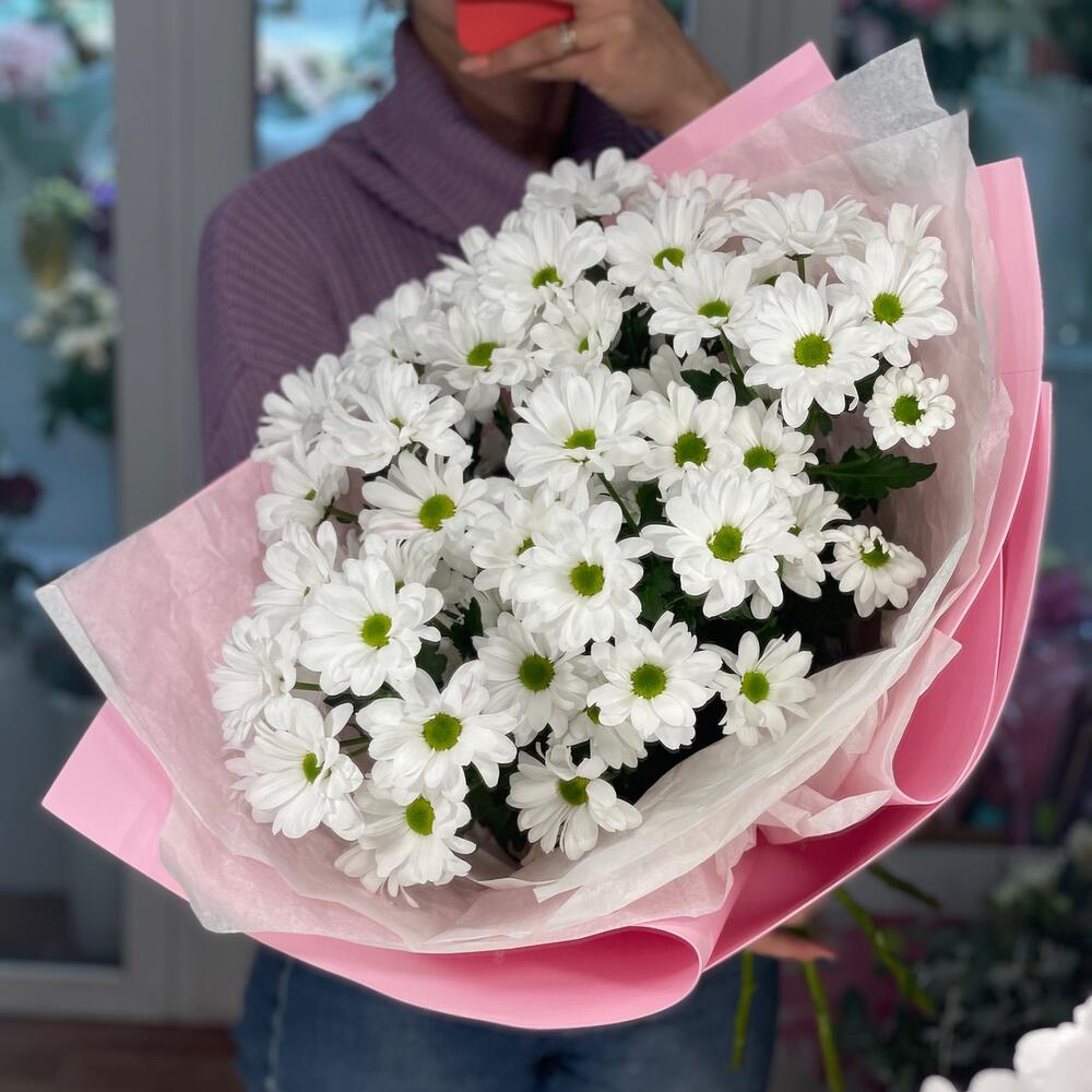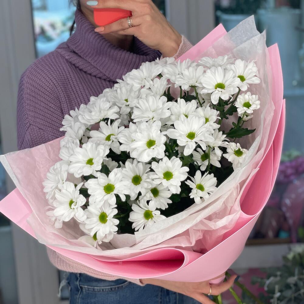 Хризантема кустовая - 5 шт. Лента атласная - 1 шт. Средство для продления жизни цветов - 1 шт. Фоамиран (упаковка) - 2 шт.