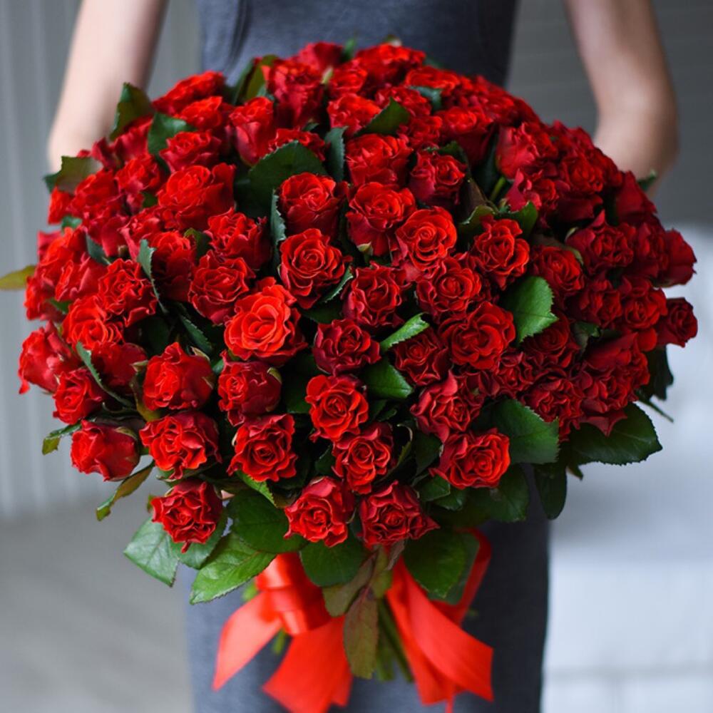 Большой монобукет из алой розы сорта Эль Торо. Эта роза отличается оригинальной формой лепестка, небольшим размером бутона и красивым насыщенным ярко-красным оттенком. Подойдет как подарок на день рождения, так и для романтичного сюрприза.