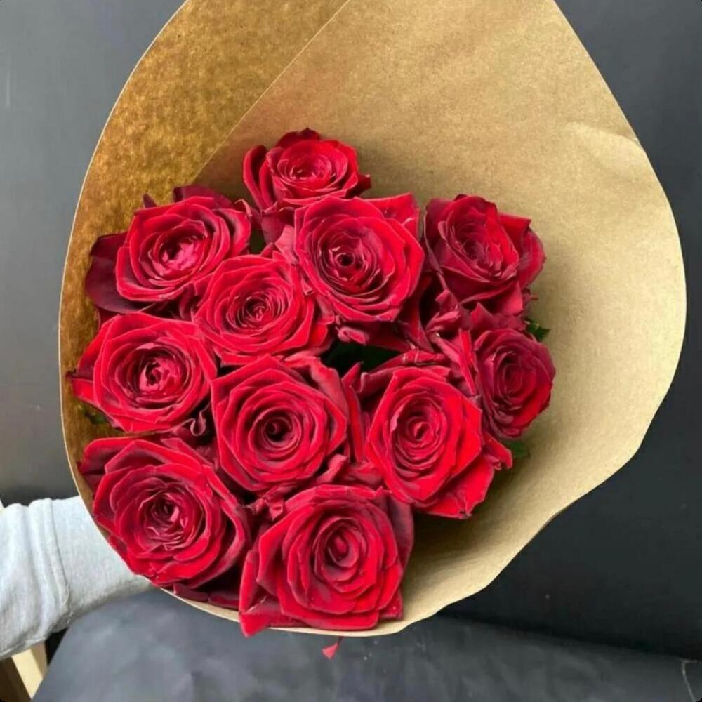 Лента атласная – 1 шт. Роза красная 60 см – 11 шт. Упаковка крафт – 2 шт.