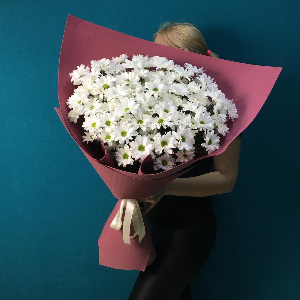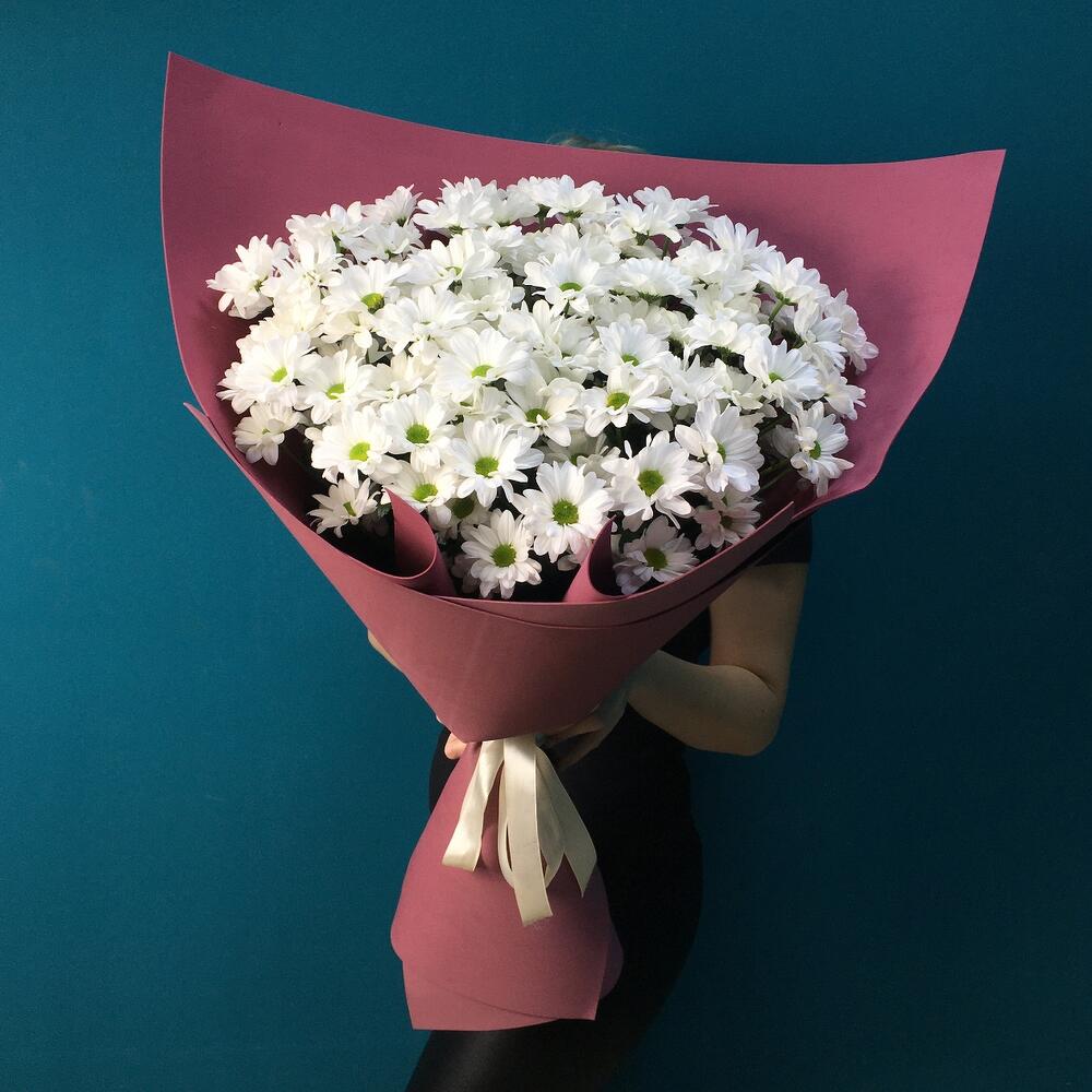 Хризантема кустовая – 15 шт. Лента атласная – 1 шт. Фоамиран (упаковка) – 3 шт. любовь флориста (бесплатно) – 1 шт.