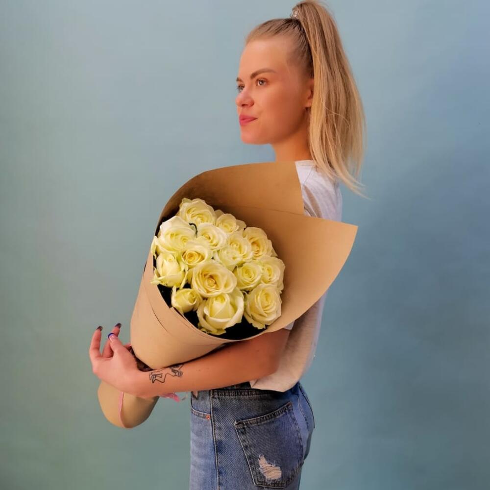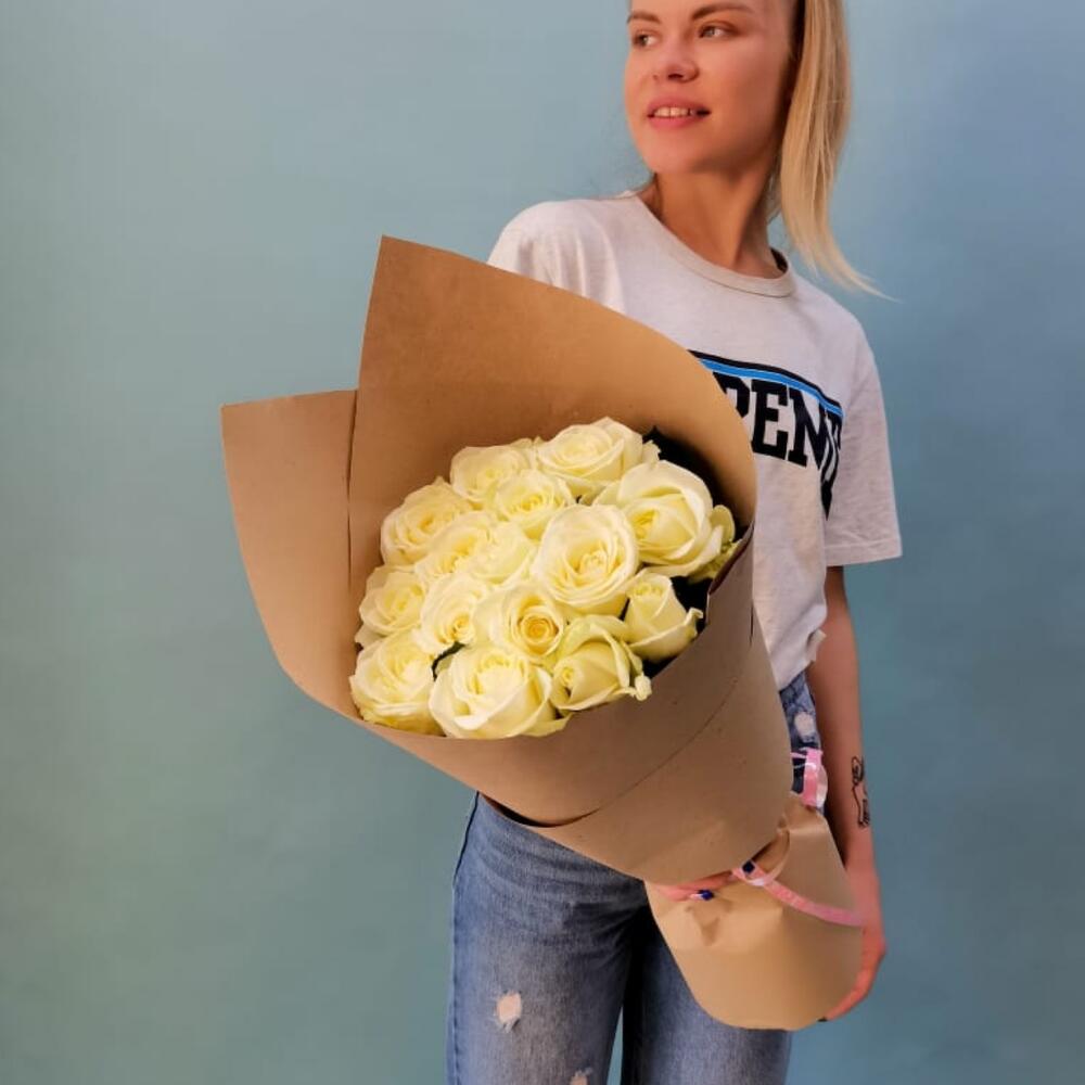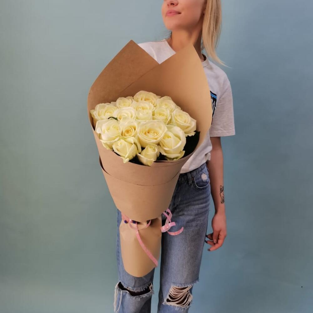Роза - 15 шт. Лента атласная - 1 шт. Крафт - 1 шт.
